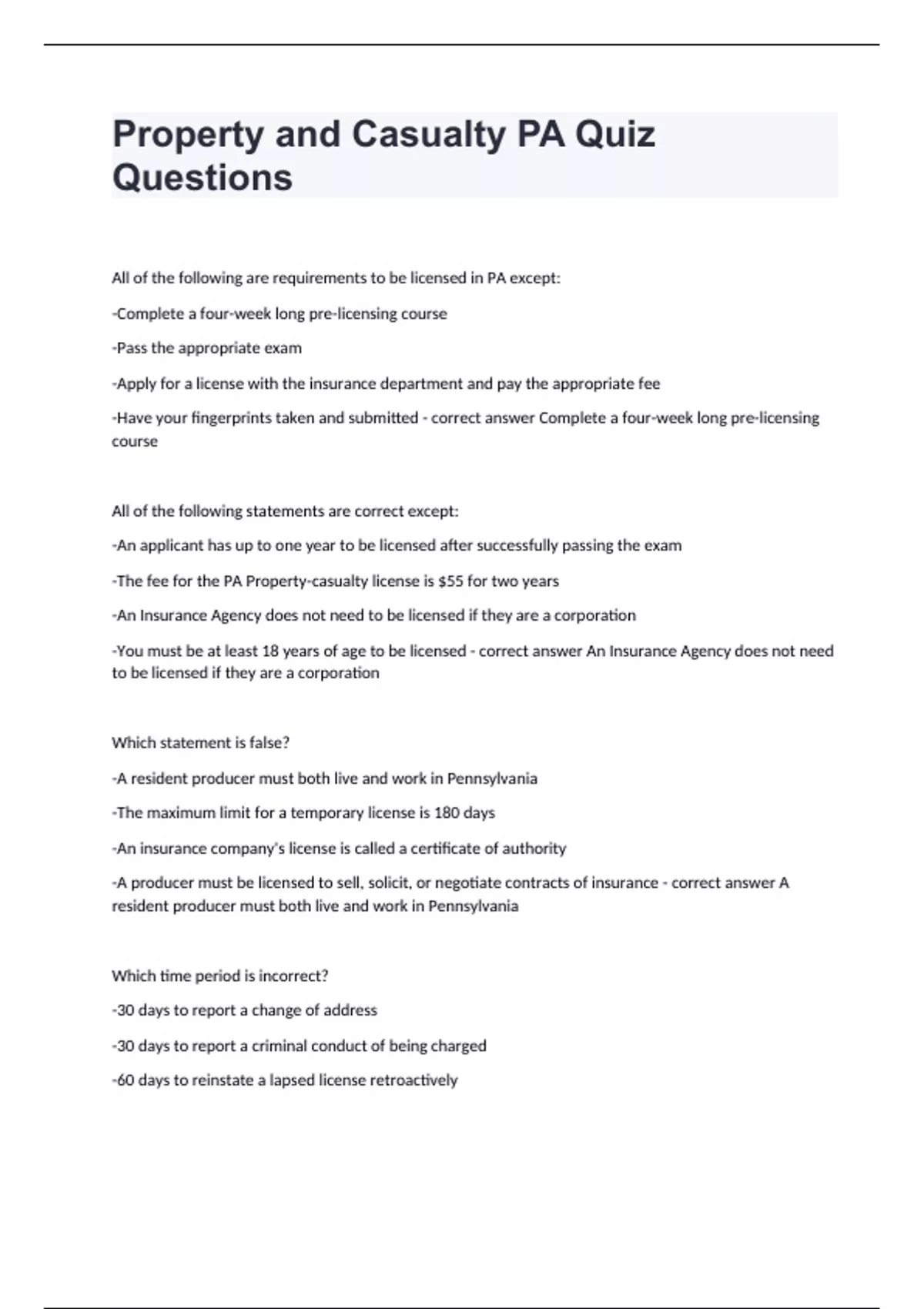 Property and Casualty PA Quiz Questions All of the following are requirements to be licensed in PA except: -Complete a four-week long pre-licensing course -Pass the appropriate exam -Apply for a license with the insurance department and pay the appropriate fee -Have your fingerprints taken and submitted - correct answer Complete a four-week long pre-licensing course All of the following statements are correct except: -An applicant has up to one year to be licensed after successfully passing the exam -The fee for the PA Property-casualty license is $55 for two years -An Insurance Agency does not need to be licensed if they are a corporation -You must be at least 18 years of age to be licensed - correct answer An Insurance Agency does not need to be licensed if they are a corporation Which statement is false? -A resident producer must both live and work in Pennsylvania -The maximum limit for a temporary license is 180 days -An insurance company's license is called a certificate of authority -A producer must be licensed to sell, solicit, or negotiate contracts of insurance - correct answer A resident producer must both live and work in Pennsylvania Which time period is incorrect? -30 days to report a change of address -30 days to report a criminal conduct of being charged -60 days to reinstate a lapsed license retroactively