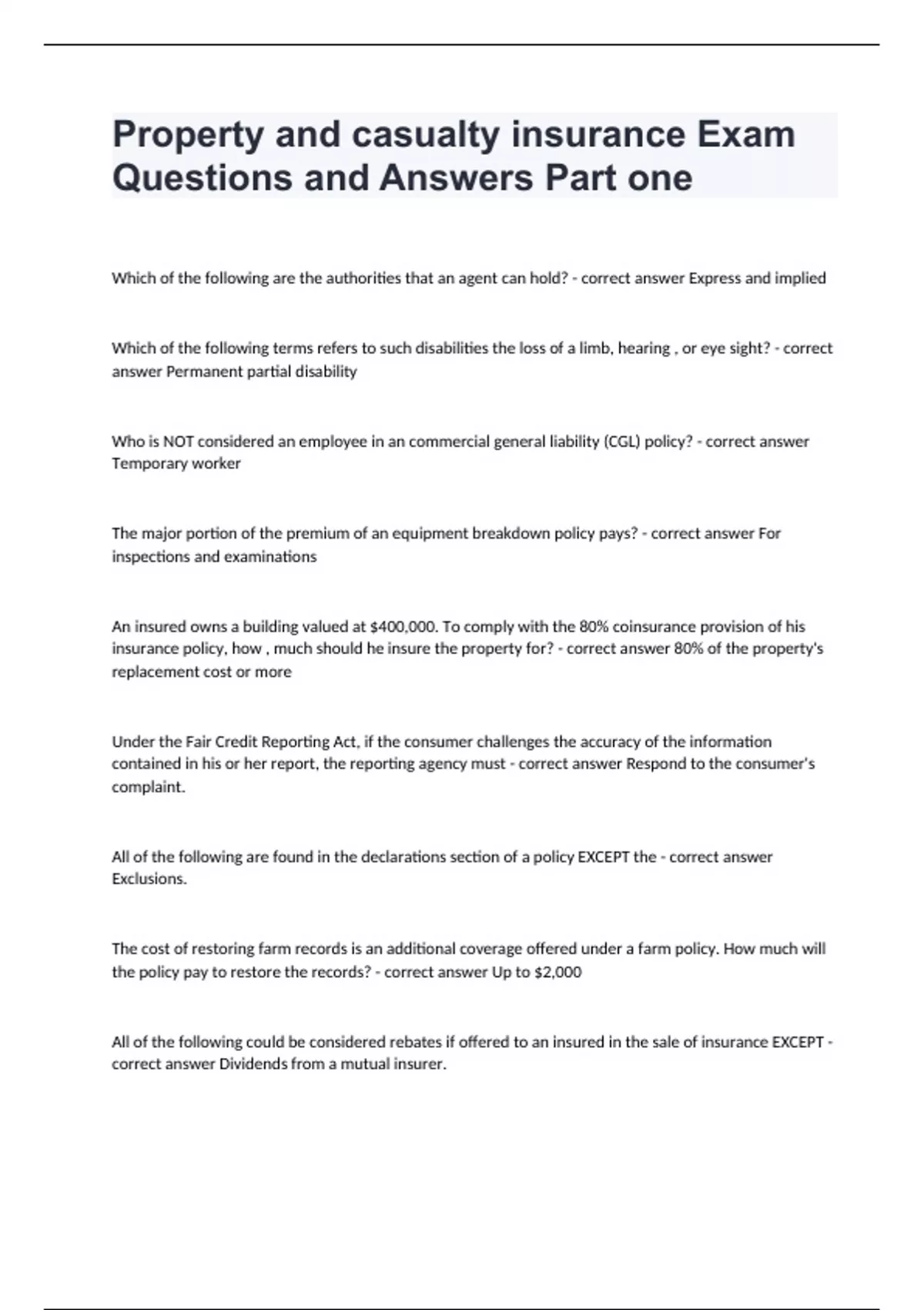 Property and casualty insurance Exam Questions and Answers Part oneWhich of the following are the authorities that an agent can hold? - correct answer Express and implied Which of the following terms refers to such disabilities the loss of a limb, hearing , or eye sight? - correct answer Permanent partial disability Who is NOT considered an employee in an commercial general liability (CGL) policy? - correct answer Temporary worker The major portion of the premium of an equipment breakdown policy pays? - correct answer For inspections and examinations An insured owns a building valued at $400,000. To comply with the 80% coinsurance provision of his insurance policy, how , much should he insure the property for? - correct answer 80% of the property's replacement cost or more Under the Fair Credit Reporting Act, if the consumer challenges the accuracy of the information contained in his or her report, the reporting agency must - correct answer Respond to the consumer's complaint. All of the following are found in the declarations section of a policy EXCEPT the - correct answer Exclusions. The cost of restoring farm records is an additional coverage offered under a farm policy. How much will the policy pay to restore the records? - correct answer Up to $2,000 All of the following could be considered rebates if offered to an insured in the sale of insurance EXCEPT - correct answer Dividends from a mutual insurer.