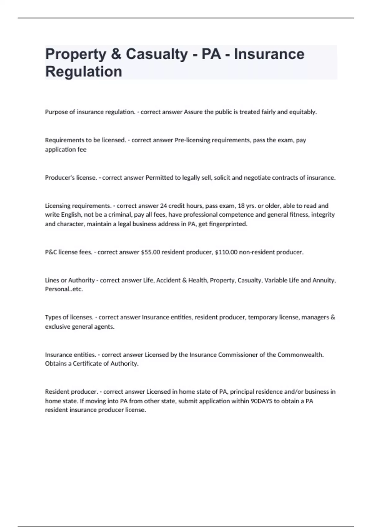 Property & Casualty - PA - Insurance RegulationPurpose of insurance regulation. - correct answer Assure the public is treated fairly and equitably. Requirements to be licensed. - correct answer Pre-licensing requirements, pass the exam, pay application fee Producer's license. - correct answer Permitted to legally sell, solicit and negotiate contracts of insurance. Licensing requirements. - correct answer 24 credit hours, pass exam, 18 yrs. or older, able to read and write English, not be a criminal, pay all fees, have professional competence and general fitness, integrity and character, maintain a legal business address in PA, get fingerprinted. P&C license fees. - correct answer $55.00 resident producer, $110.00 non-resident producer. Lines or Authority - correct answer Life, Accident & Health, Property, Casualty, Variable Life and Annuity, Personal..etc. Types of licenses. - correct answer Insurance entities, resident producer, temporary license, managers & exclusive general agents. Insurance entities. - correct answer Licensed by the Insurance Commissioner of the Commonwealth. Obtains a Certificate of Authority. Resident producer. - correct answer Licensed in home state of PA, principal residence and/or business in home state. If moving into PA from other state, submit application within 90DAYS to obtain a PA resident insurance producer license.