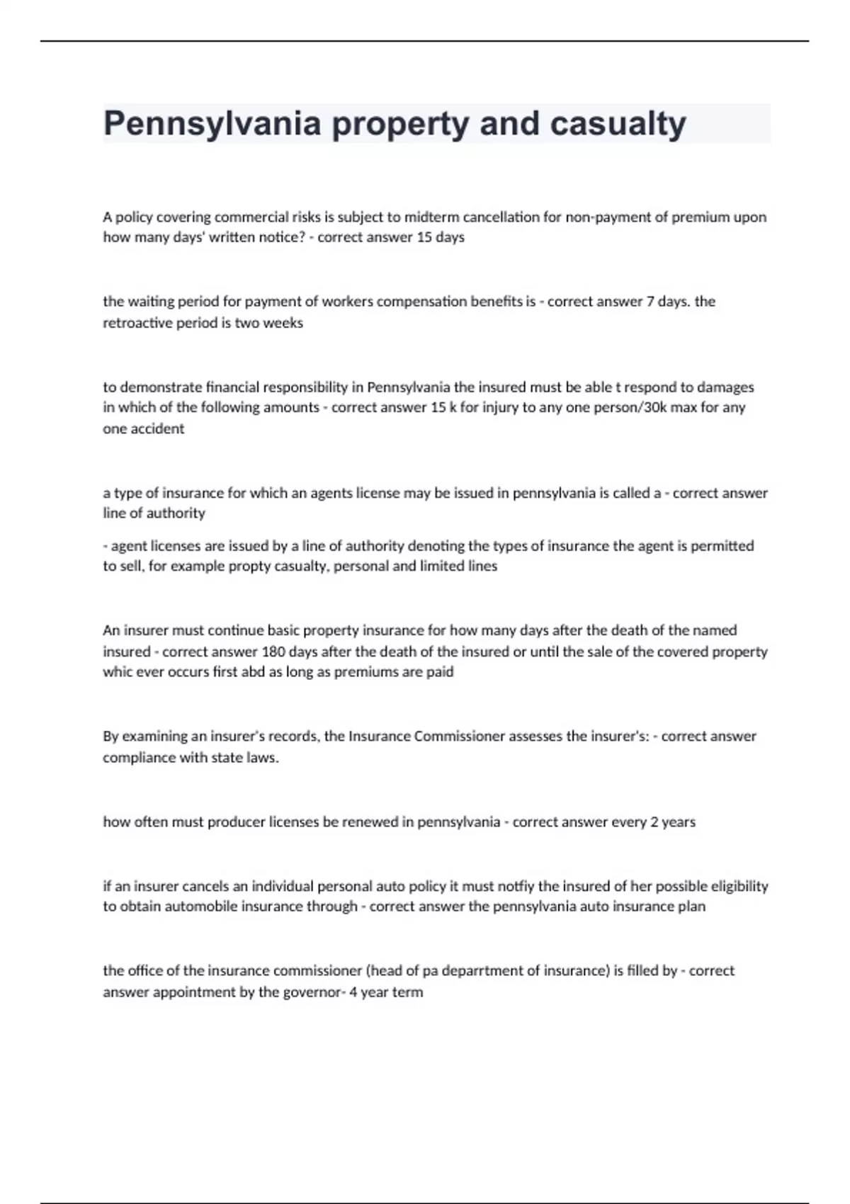 Pennsylvania property and casualtyA policy covering commercial risks is subject to midterm cancellation for non-payment of premium upon how many days' written notice? - correct answer 15 days the waiting period for payment of workers compensation benefits is - correct answer 7 days. the retroactive period is two weeks to demonstrate financial responsibility in Pennsylvania the insured must be able t respond to damages in which of the following amounts - correct answer 15 k for injury to any one person/30k max for any one accident a type of insurance for which an agents license may be issued in pennsylvania is called a - correct answer line of authority - agent licenses are issued by a line of authority denoting the types of insurance the agent is permitted to sell, for example propty casualty, personal and limited lines An insurer must continue basic property insurance for how many days after the death of the named insured - correct answer 180 days after the death of the insured or until the sale of the covered property whic ever occurs first abd as long as premiums are paid By examining an insurer's records, the Insurance Commissioner assesses the insurer's: - correct answer compliance with state laws. how often must producer licenses be renewed in pennsylvania - correct answer every 2 years if an insurer cancels an individual personal auto policy it must notfiy the insured of her possible eligibility to obtain automobile insurance through - correct answer the pennsylvania auto insurance plan