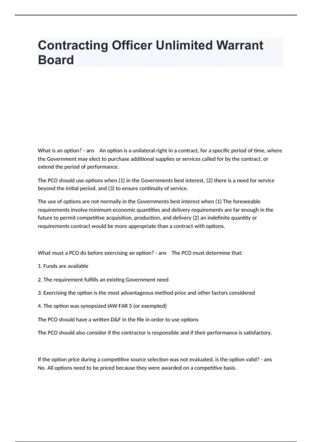 What is an option? - ans An option is a unilateral right in a contract, for a specific period of time, where the Government may elect to purchase additional supplies or services called for by the contract, or extend the period of performance. The PCO should use options when (1) in the Governments best interest, (2) there is a need for service beyond the initial period, and (3) to ensure continuity of service. The use of options are not normally in the Governments best interest when (1) The foreseeable requirements involve minimum economic quantities and delivery requirements are far enough in the future to permit competitive acquisition, production, and delivery (2) an indefinite quantity or requirements contract would be more appropriate than a contract with options. What must a PCO do before exercising an option? - ans The PCO must determine that: 1. Funds are available 2. The requirement fulfills an existing Government need 3. Exercising the option is the most advantageous method price and other factors considered 4. The option was synopsized IAW FAR 5 (or exempted) The PCO should have a written D&F in the file in order to use options The PCO should also consider if the contractor is responsible and if their performance is satisfactory. If the option price during a competitive source selection was not evaluated, is the option valid? - ans No. All options need to be priced because they were awarded on a competitive basis.