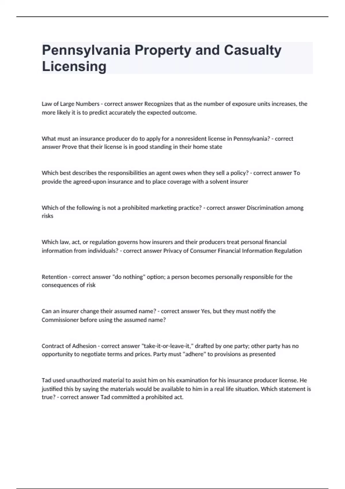 Pennsylvania Property and Casualty LicensingLaw of Large Numbers - correct answer Recognizes that as the number of exposure units increases, the more likely it is to predict accurately the expected outcome. What must an insurance producer do to apply for a nonresident license in Pennsylvania? - correct answer Prove that their license is in good standing in their home state Which best describes the responsibilities an agent owes when they sell a policy? - correct answer To provide the agreed-upon insurance and to place coverage with a solvent insurer Which of the following is not a prohibited marketing practice? - correct answer Discrimination among risks Which law, act, or regulation governs how insurers and their producers treat personal financial information from individuals? - correct answer Privacy of Consumer Financial Information Regulation Retention - correct answer "do nothing" option; a person becomes personally responsible for the consequences of risk Can an insurer change their assumed name? - correct answer Yes, but they must notify the Commissioner before using the assumed name? Contract of Adhesion - correct answer "take-it-or-leave-it," drafted by one party; other party has no opportunity to negotiate terms and prices. Party must "adhere" to provisions as presented Tad used unauthorized material to assist him on his examination for his insurance producer license. He justified this by saying the materials would be available to him in a real life situation. Which statement is true? - correct answer Tad committed a prohibited act.