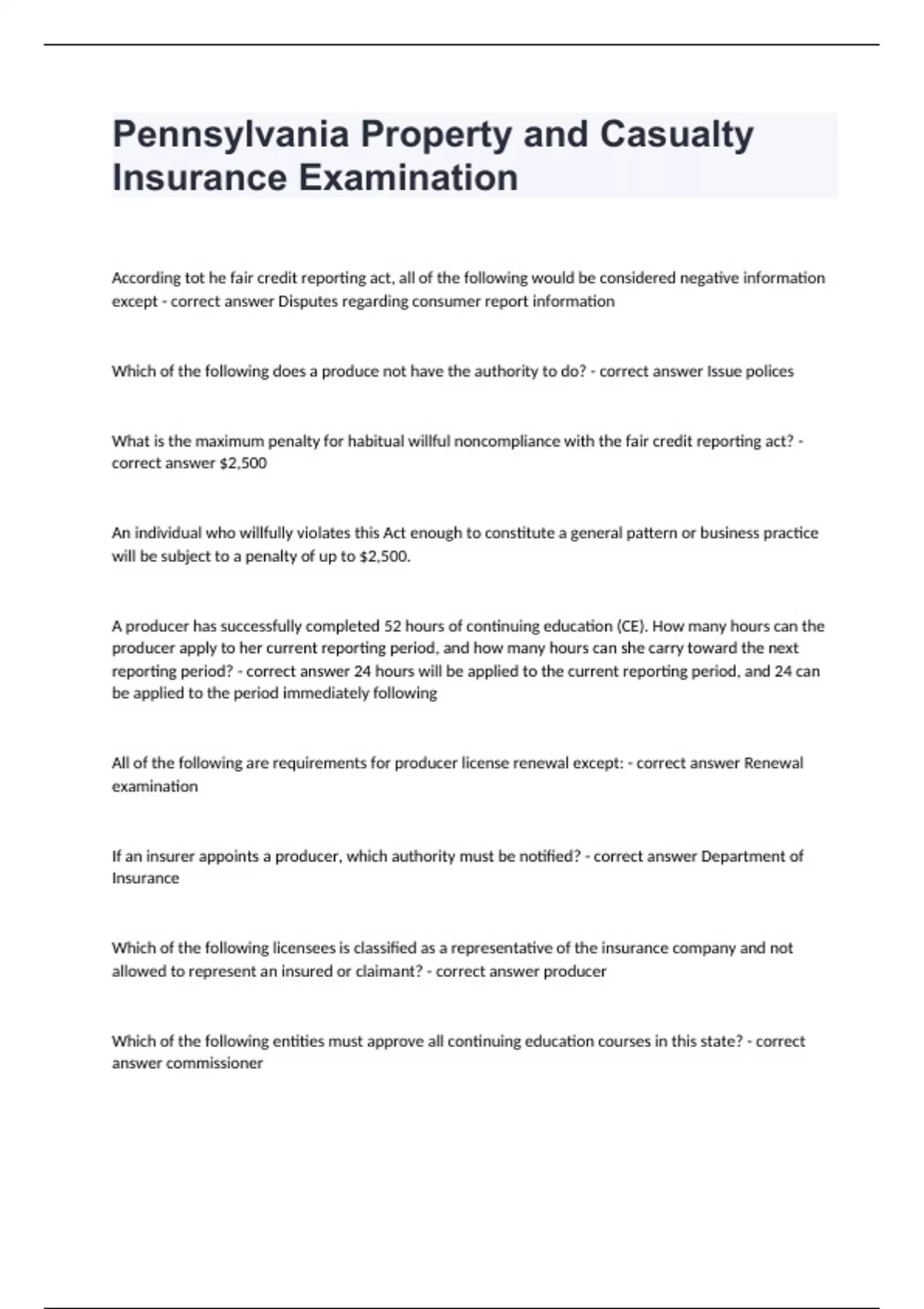 Pennsylvania Property and Casualty Insurance ExaminationAccording tot he fair credit reporting act, all of the following would be considered negative information except - correct answer Disputes regarding consumer report information Which of the following does a produce not have the authority to do? - correct answer Issue polices What is the maximum penalty for habitual willful noncompliance with the fair credit reporting act? - correct answer $2,500 An individual who willfully violates this Act enough to constitute a general pattern or business practice will be subject to a penalty of up to $2,500. A producer has successfully completed 52 hours of continuing education (CE). How many hours can the producer apply to her current reporting period, and how many hours can she carry toward the next reporting period? - correct answer 24 hours will be applied to the current reporting period, and 24 can be applied to the period immediately following All of the following are requirements for producer license renewal except: - correct answer Renewal examination If an insurer appoints a producer, which authority must be notified? - correct answer Department of Insurance Which of the following licensees is classified as a representative of the insurance company and not allowed to represent an insured or claimant? - correct answer producer Which of the following entities must approve all continuing education courses in this state? - correct answer commissioner