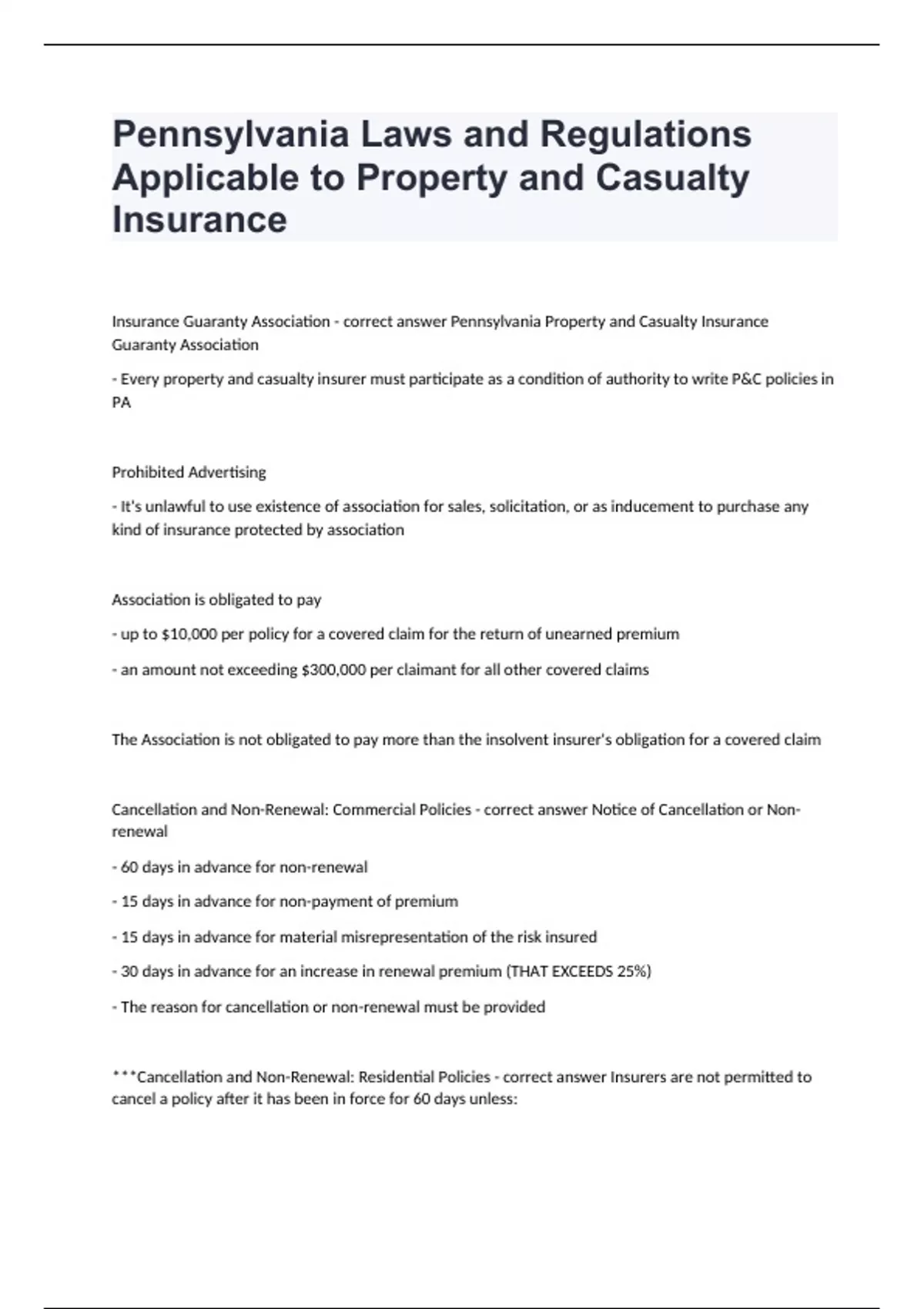 Pennsylvania Laws and Regulations Applicable to Property and Casualty InsuranceInsurance Guaranty Association - correct answer Pennsylvania Property and Casualty Insurance Guaranty Association - Every property and casualty insurer must participate as a condition of authority to write P&C policies in PA Prohibited Advertising - It's unlawful to use existence of association for sales, solicitation, or as inducement to purchase any kind of insurance protected by association Association is obligated to pay - up to $10,000 per policy for a covered claim for the return of unearned premium - an amount not exceeding $300,000 per claimant for all other covered claims The Association is not obligated to pay more than the insolvent insurer's obligation for a covered claim Cancellation and Non-Renewal: Commercial Policies - correct answer Notice of Cancellation or Non-renewal - 60 days in advance for non-renewal - 15 days in advance for non-payment of premium - 15 days in advance for material misrepresentation of the risk insured - 30 days in advance for an increase in renewal premium (THAT EXCEEDS 25%) - The reason for cancellation or non-renewal must be provided ***Cancellation and Non-Renewal: Residential Policies - correct answer Insurers are not permitted to cancel a policy after it has been in force for 60 days unless:
