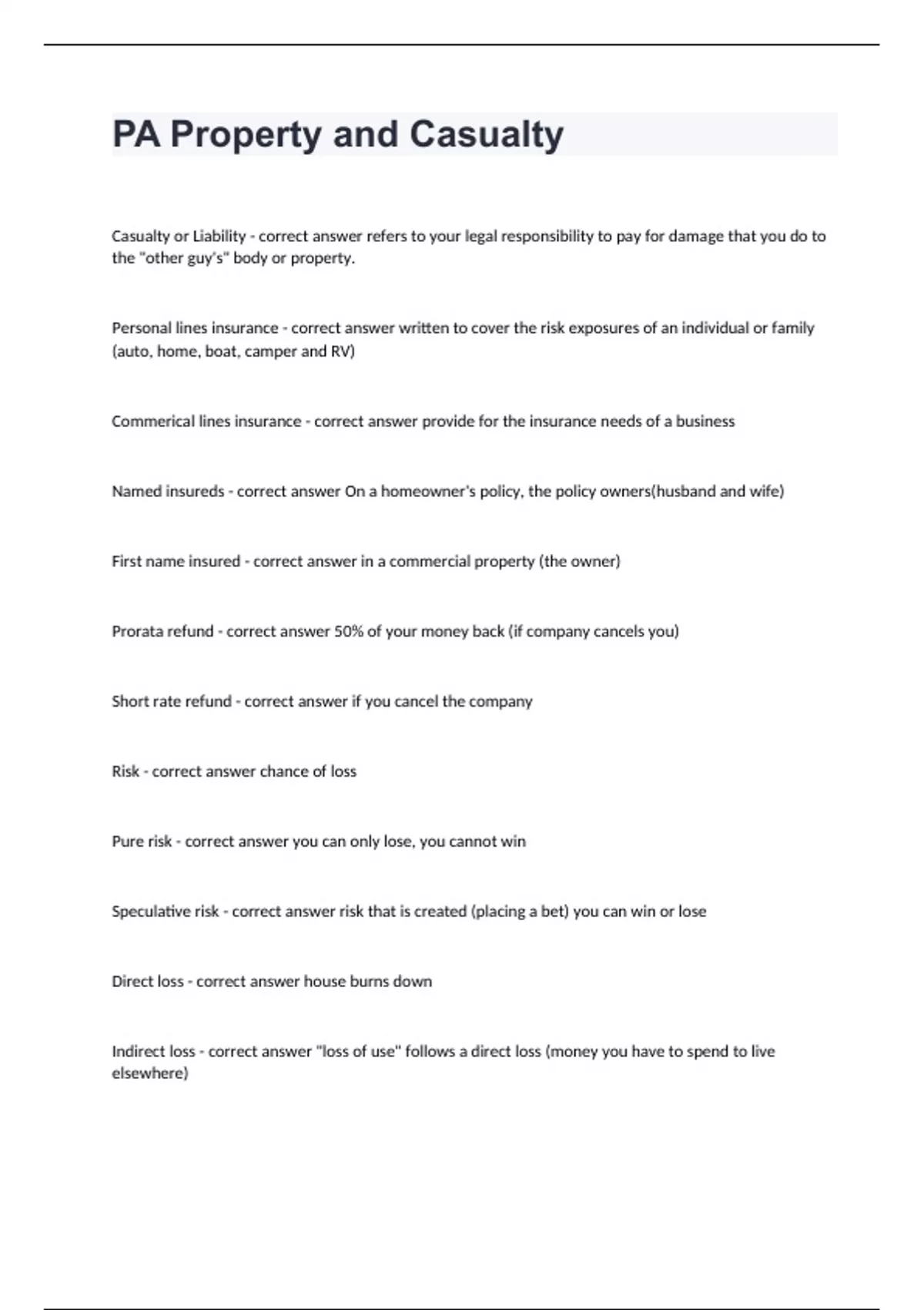 PA Property and Casualty Casualty or Liability - correct answer refers to your legal responsibility to pay for damage that you do to the "other guy's" body or property. Personal lines insurance - correct answer written to cover the risk exposures of an individual or family (auto, home, boat, camper and RV) Commerical lines insurance - correct answer provide for the insurance needs of a business Named insureds - correct answer On a homeowner's policy, the policy owners(husband and wife) First name insured - correct answer in a commercial property (the owner) Prorata refund - correct answer 50% of your money back (if company cancels you) Short rate refund - correct answer if you cancel the company Risk - correct answer chance of loss Pure risk - correct answer you can only lose, you cannot win Speculative risk - correct answer risk that is created (placing a bet) you can win or lose Direct loss - correct answer house burns down Indirect loss - correct answer "loss of use" follows a direct loss (money you have to spend to live elsewhere)