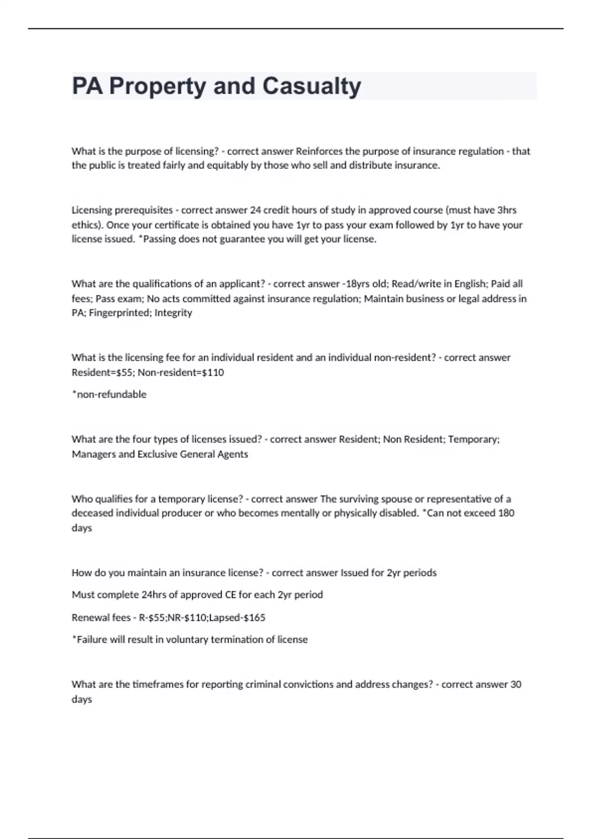 PA Property and CasualtyWhat is the purpose of licensing? - correct answer Reinforces the purpose of insurance regulation - that the public is treated fairly and equitably by those who sell and distribute insurance. Licensing prerequisites - correct answer 24 credit hours of study in approved course (must have 3hrs ethics). Once your certificate is obtained you have 1yr to pass your exam followed by 1yr to have your license issued. *Passing does not guarantee you will get your license. What are the qualifications of an applicant? - correct answer -18yrs old; Read/write in English; Paid all fees; Pass exam; No acts committed against insurance regulation; Maintain business or legal address in PA; Fingerprinted; Integrity What is the licensing fee for an individual resident and an individual non-resident? - correct answer Resident=$55; Non-resident=$110 *non-refundable What are the four types of licenses issued? - correct answer Resident; Non Resident; Temporary; Managers and Exclusive General Agents Who qualifies for a temporary license? - correct answer The surviving spouse or representative of a deceased individual producer or who becomes mentally or physically disabled. *Can not exceed 180 days How do you maintain an insurance license? - correct answer Issued for 2yr periods Must complete 24hrs of approved CE for each 2yr period Renewal fees - R-$55;NR-$110;Lapsed-$165 *Failure will result in voluntary termination of license What are the timeframes for reporting criminal convictions and address changes? - correct answer 30 days