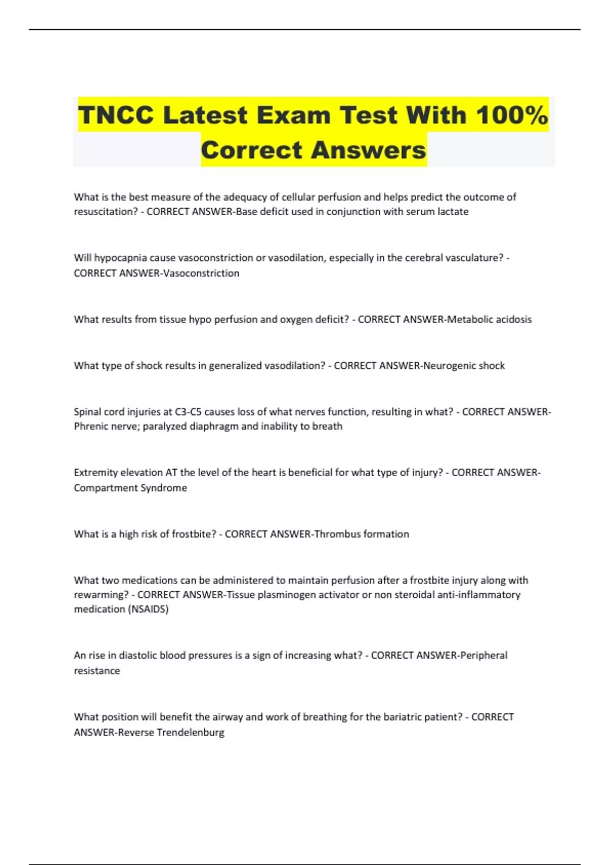 TNCC Latest Exam Test With 100% Correct Answers