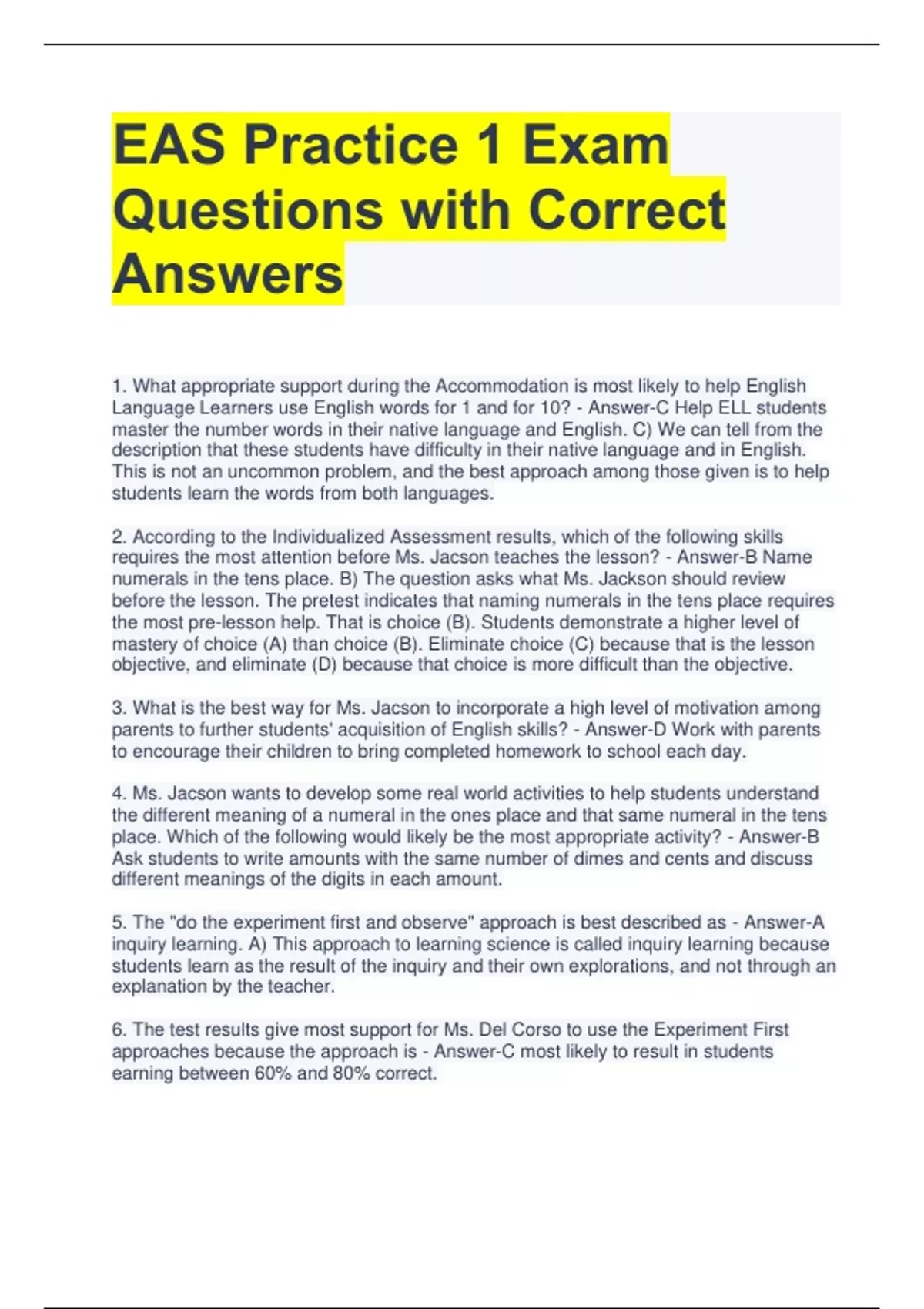 EAS Practice 1 Exam Questions with Correct Answers 1. What appropriate support during the Accommodation is most likely to help English Language Learners use English words for 1 and for 10? - Answer-C Help ELL students master the number words in their native language and English. C) We can tell from the description that these students have difficulty in their native language and in English. This is not an uncommon problem, and the best approach among those given is to help students learn the words from both languages. 2. According to the Individualized Assessment results, which of the following skills requires the most attention before Ms. Jacson teaches the lesson? - Answer-B Name numerals in the tens place. B) The question asks what Ms. Jackson should review before the lesson. The pretest indicates that naming numerals in the tens place requires the most pre-lesson help. That is choice (B). Students demonstrate a higher level of mastery of choice (A) than choice (B). Eliminate choice (C) because that is the lesson objective, and eliminate (D) because that choice is more difficult than the objective. 3. What is the best way for Ms. Jacson to incorporate a high level of motivation among parents to further students' acquisition of English skills? - Answer-D Work with parents to encourage their children to bring completed homework to school each day. 4. Ms. Jacson wants to develop some real world activities to help students understand the different meaning of a numeral in the ones place and that same numeral in the tens place. Which of the following would likely be the most appropriate activity? - Answer-B Ask students to write amounts with the same number of dimes and cents and discuss different meanings of the digits in each amount. 5. The "do the experiment first and observe" approach is best described as - Answer-A inquiry learning. A) This approach to learning science is called inquiry learning because students learn as the result of the inquiry and their own explorations, and not through an explanation by the teacher. 6. The test results give most support for Ms. Del Corso to use the Experiment First approaches because the approach is - Answer-C most likely to result in students earning between 60% and 80% correct. 7. Which explanation could students give that would best explain why the egg ended up in the bottle? - Answer-D The air pressure in the bottle is lowered causing the egg to be pushed into the bottle. D) The air pressure inside the bottle is lowered to the point where the outside pressure is more than the lowered inside pressure. The outside air pressure actually pushes the egg into the bottle.
