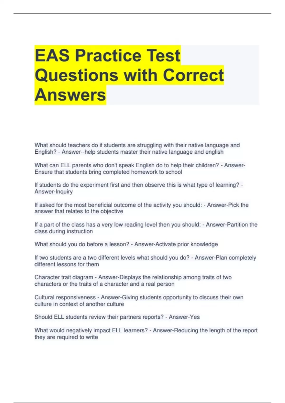 EAS Practice Test Questions with Correct Answers What should teachers do if students are struggling with their native language and English? - Answer--help students master their native language and english What can ELL parents who don't speak English do to help their children? - AnswerEnsure that students bring completed homework to school If students do the experiment first and then observe this is what type of learning? - Answer-Inquiry If asked for the most beneficial outcome of the activity you should: - Answer-Pick the answer that relates to the objective If a part of the class has a very low reading level then you should: - Answer-Partition the class during instruction What should you do before a lesson? - Answer-Activate prior knowledge If two students are a two different levels what should you do? - Answer-Plan completely different lessons for them Character trait diagram - Answer-Displays the relationship among traits of two characters or the traits of a character and a real person Cultural responsiveness - Answer-Giving students opportunity to discuss their own culture in context of another culture Should ELL students review their partners reports? - Answer-Yes What would negatively impact ELL learners? - Answer-Reducing the length of the report they are required to write