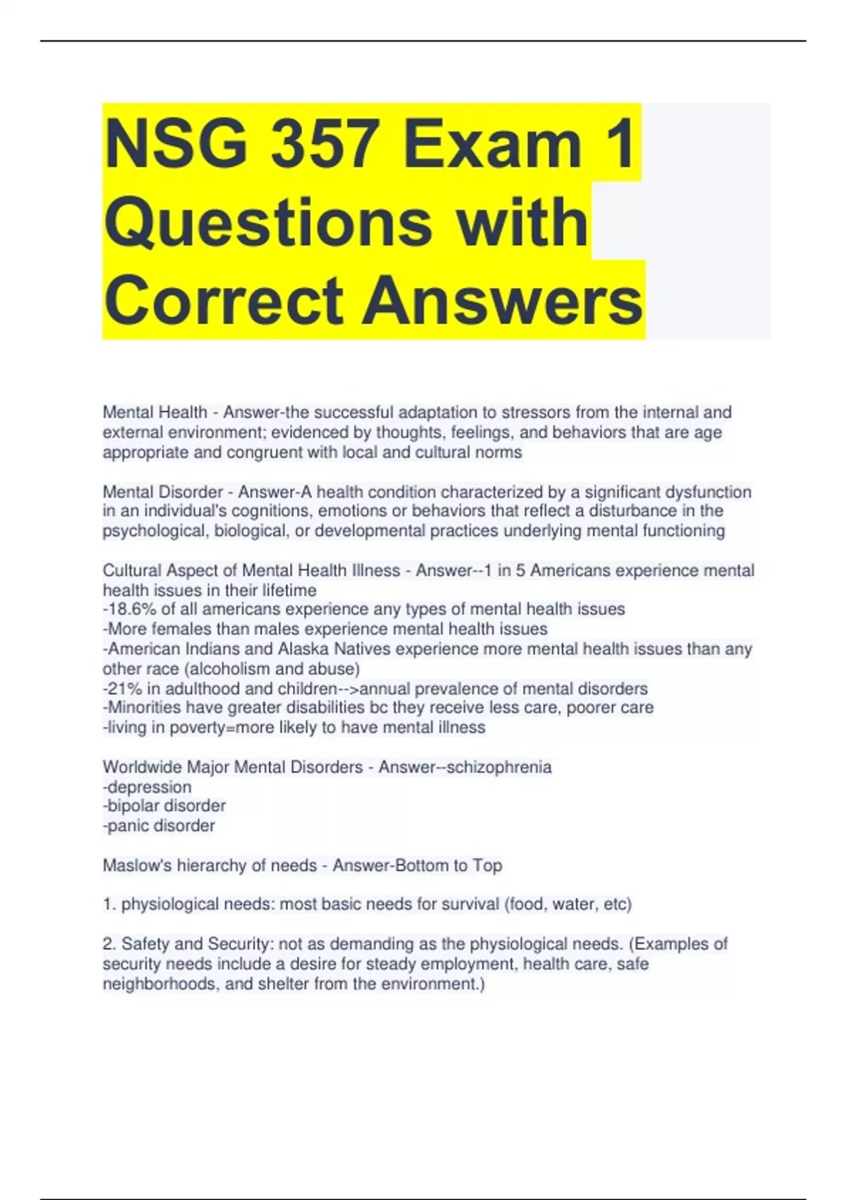 NSG 357 Exam 1 Questions with Correct Answers Mental Health - Answer-the successful adaptation to stressors from the internal and external environment; evidenced by thoughts, feelings, and behaviors that are age appropriate and congruent with local and cultural norms Mental Disorder - Answer-A health condition characterized by a significant dysfunction in an individual's cognitions, emotions or behaviors that reflect a disturbance in the psychological, biological, or developmental practices underlying mental functioning Cultural Aspect of Mental Health Illness - Answer--1 in 5 Americans experience mental health issues in their lifetime -18.6% of all americans experience any types of mental health issues -More females than males experience mental health issues -American Indians and Alaska Natives experience more mental health issues than any other race (alcoholism and abuse) -21% in adulthood and children--annual prevalence of mental disorders -Minorities have greater disabilities bc they receive less care, poorer care -living in poverty=more likely to have mental illness Worldwide Major Mental Disorders - Answer--schizophrenia -depression -bipolar disorder -panic disorder Maslow's hierarchy of needs - Answer-Bottom to Top 1. physiological needs: most basic needs for survival (food, water, etc) 2. Safety and Security: not as demanding as the physiological needs. (Examples of security needs include a desire for steady employment, health care, safe neighborhoods, and shelter from the environment.) 3. Social Needs: need for belonging, love, and affection (Relationships such as friendships, romantic attachments, and families help fulfill this need for companionship and acceptance, as does involvement in social, community, or religious groups.) 4. Esteem Needs: need for things that reflect on self-esteem, personal worth, social recognition, and accomplishment. 5. Self-Actualizing Needs: Highest level. Self-actualizing people are self-aware, concerned with personal growth, less concerned with the opinions of others, and interested fulfilling their potential. Hans Seyle's Physical Response to stress - Answer-General adaptation syndrome: fight or flight 1. alarm reaction stage--fight or flight 2. Stage of resistance--attempt to adapt to stressors