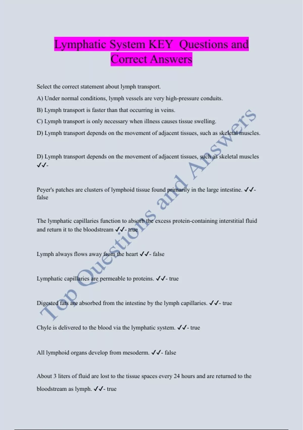 Lymphatic System KEY Questions and Correct Answers