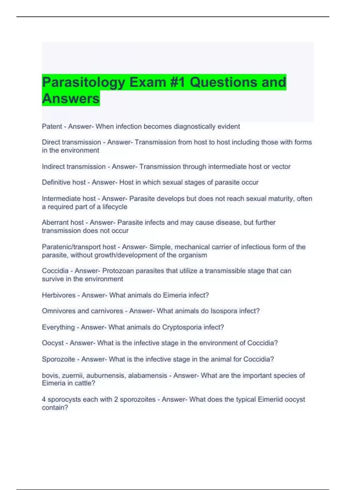 Parasitology Exam #1 Questions and Answers