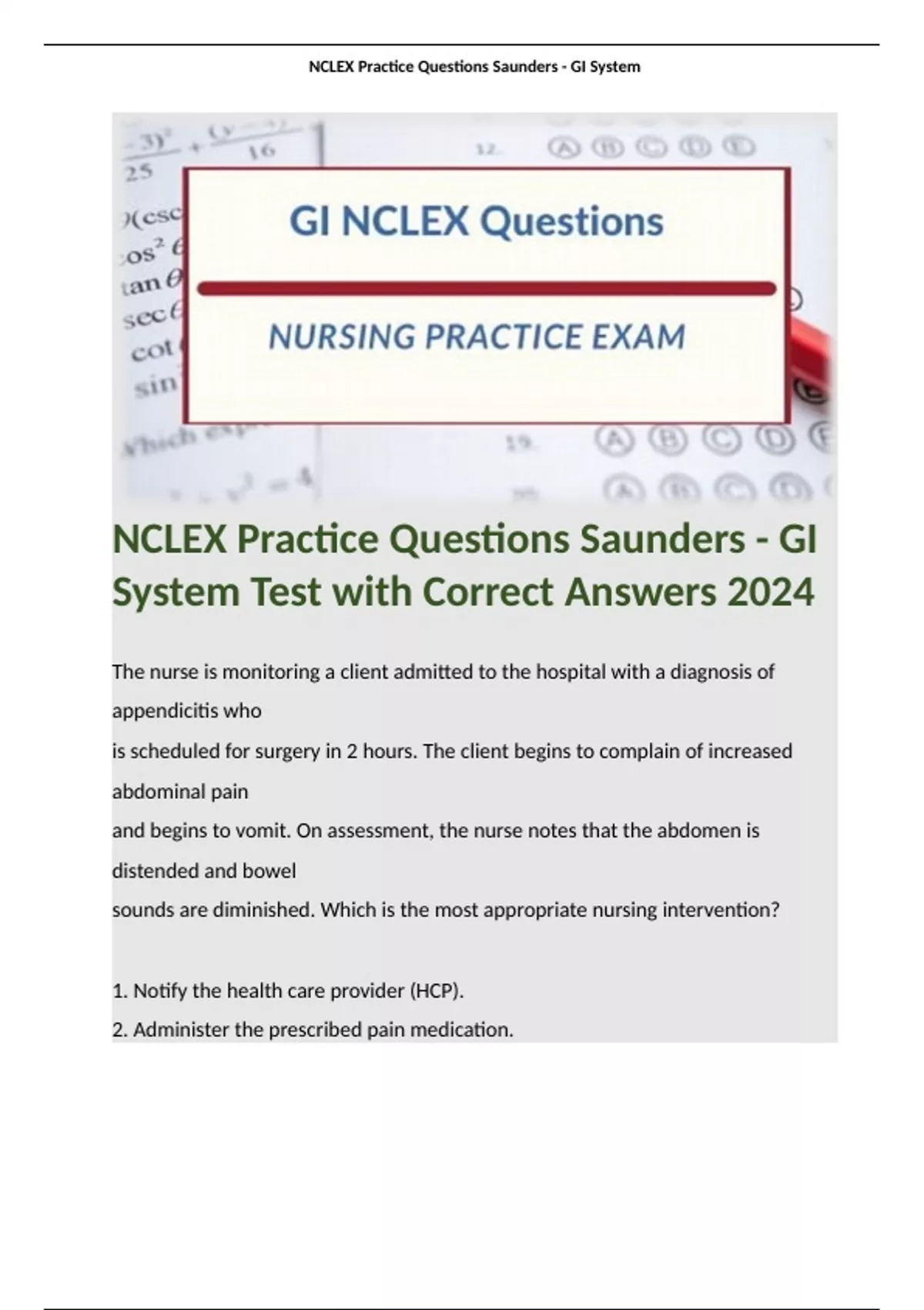 NCLEX Practice Questions Saunders - GI System Test with Correct Answers 2024
