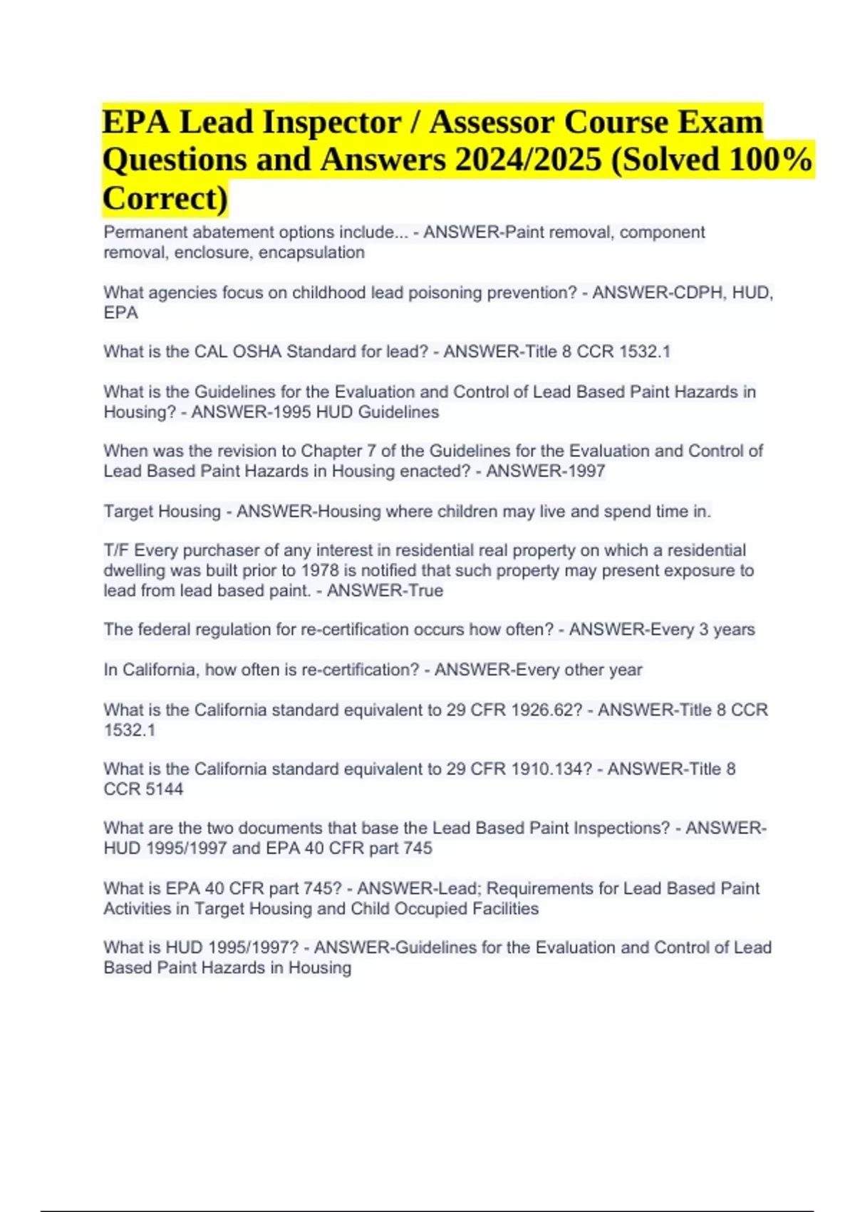 EPA Lead Inspector Exam Questions With Answers 2024/2025 (100% Correct) Permanent abatement options include... - ANSWER-Paint removal, component removal, enclosure, encapsulation What agencies focus on childhood lead poisoning prevention? - ANSWER-CDPH, HUD, EPA What is the CAL OSHA Standard for lead? - ANSWER-Title 8 CCR 1532.1 What is the Guidelines for the Evaluation and Control of Lead Based Paint Hazards in Housing? - ANSWER-1995 HUD Guidelines When was the revision to Chapter 7 of the Guidelines for the Evaluation and Control of Lead Based Paint Hazards in Housing enacted? - ANSWER-1997 Target Housing - ANSWER-Housing where children may live and spend time in. T/F Every purchaser of any interest in residential real property on which a residential dwelling was built prior to 1978 is notified that such property may present exposure to lead from lead based paint. - ANSWER-True The federal regulation for re-certification occurs how often? - ANSWER-Every 3 years In California, how often is re-certification? - ANSWER-Every other year What is the California standard equivalent to 29 CFR 1926.62? - ANSWER-Title 8 CCR 1532.1 What is the California standard equivalent to 29 CFR 1910.134? - ANSWER-Title 8 CCR 5144 What are the two documents that base the Lead Based Paint Inspections? - ANSWERHUD 1995/1997 and EPA 40 CFR part 745 What is EPA 40 CFR part 745? - ANSWER-Lead; Requirements for Lead Based Paint Activities in Target Housing and Child Occupied Facilities What is HUD 1995/1997? - ANSWER-Guidelines for the Evaluation and Control of Lead Based Paint Hazards in Housing EPA Lead Inspector / Assessor Course Exam Questions and Answers 2024/2025 (Solved 100% Correct) Lead based paint - ANSWER-paint, varnish, shellac or other coating on surfaces that contain 1.0 mg/cm2 or more of lead or 0.5% or more lead in weight Lead based paint hazards - ANSWER-any condition that cause exposure to lead contaminated dust, lead contaminated soil or lead contaminated paint that is deteriorated or present in accessible surfaces, friction surfaces, or impact surfaces that would result in adverse human health effects Lead based paint inspection - ANSWER-a surface-by-surface investigation to determine the presence of lead based paint and the provision of a report explaining the results of the investigation What are the HUD primary substrates? - ANSWER-brick, concrete, drywall, metal, wood, and plaster What is the inspector's job during an inspection? - ANSWER-To test a surface in the interior of each dwelling unit that is representative of each type of painted, stained, shellacked or varnished testing combination in every room equivalent. T/F Lead inspection includes soil testing. - ANSWER-False - soil testing is part of a risk assessment or if requested by the owner Room equivalent - ANSWER-an identifiable part of a residence, such as a room, house exterior, a foyer, staircase, hallway or an exterior area (play areas, painted swing sets, painted sandboxes, fences, etc.) Building component type - ANSWER-those items in the interior or exterior of housing onto which paint, stain, varnish or shellac has been applied and that have a common substrate Substrate - ANSWER-the material underneath the paint Testing combination - ANSWER-unique combination of room equivalent, building component type and substrate Deteriorated paint - ANSWER-any interior or exterior paint that is peeling, chipping, chalking, cracking or is located on an interior or exterior surface or fixture that is damaged or deteriorated Accessible surface - ANSWER-surface that protrudes from the surrounding area to the extent that a child can chew the surface and is within three feet of the floor or ground (e.g. window wills, railing and the edges of stair treads)