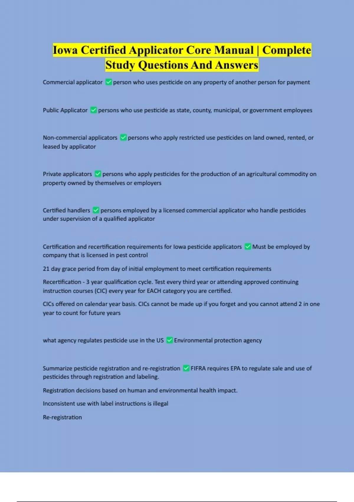 Iowa Certified Applicator Core Manual | Complete Study Questions And Answers Iowa Certified Applicator Core Manual | Complete Study Questions And Answers
