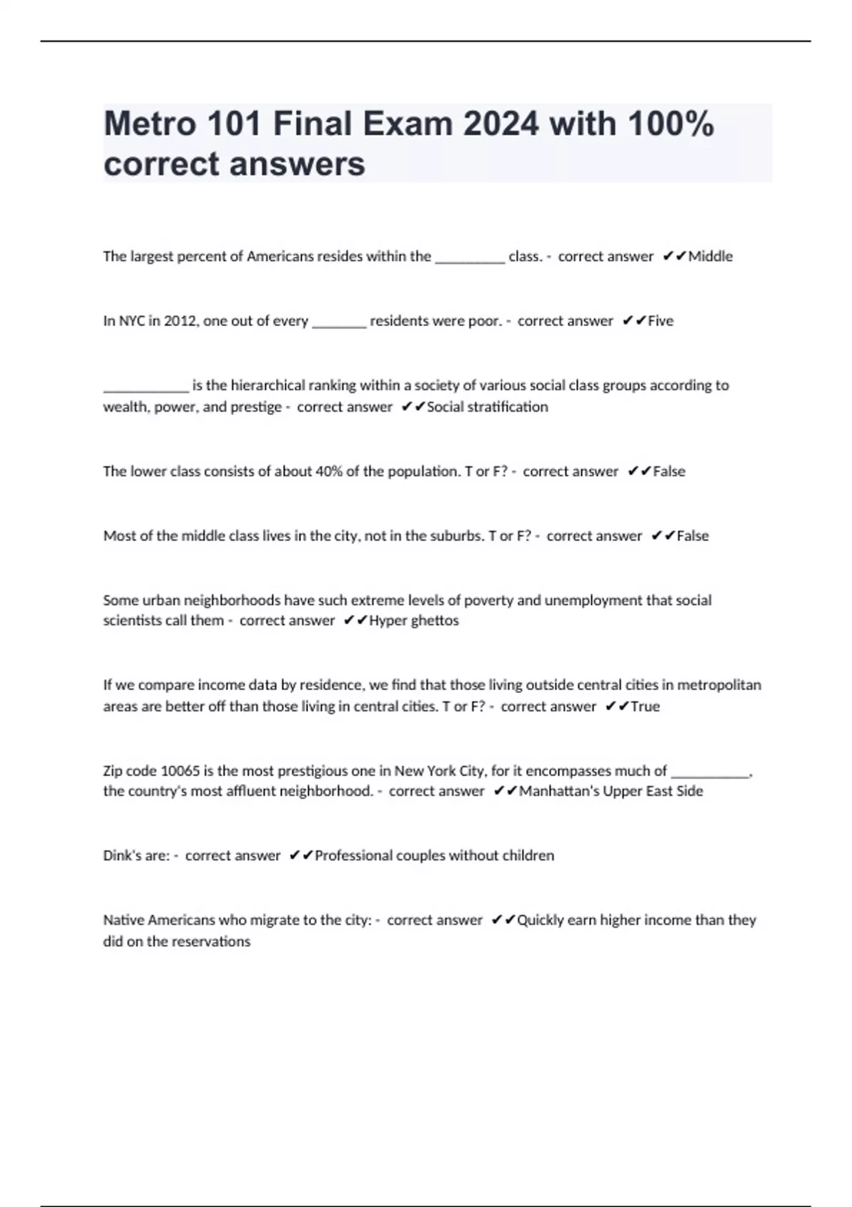The largest percent of Americans resides within the _________ class. - correct answer Middle In NYC in 2012, one out of every _______ residents were poor. - correct answer Five ___________ is the hierarchical ranking within a society of various social class groups according to wealth, power, and prestige - correct answer Social stratification The lower class consists of about 40% of the population. T or F? - correct answer False Most of the middle class lives in the city, not in the suburbs. T or F? - correct answer False Some urban neighborhoods have such extreme levels of poverty and unemployment that social scientists call them - correct answer Hyper ghettos If we compare income data by residence, we find that those living outside central cities in metropolitan areas are better off than those living in central cities. T or F? - correct answer True Zip code 10065 is the most prestigious one in New York City, for it encompasses much of __________, the country's most affluent neighborhood. - correct answer Manhattan's Upper East Side Dink's are: - correct answer Professional couples without children Native Americans who migrate to the city: - correct answer Quickly earn higher income than they did on the reservations Female participation in the labor force: - correct answer was very limited among upper-and middle-class women throughout the nineteenth century Which