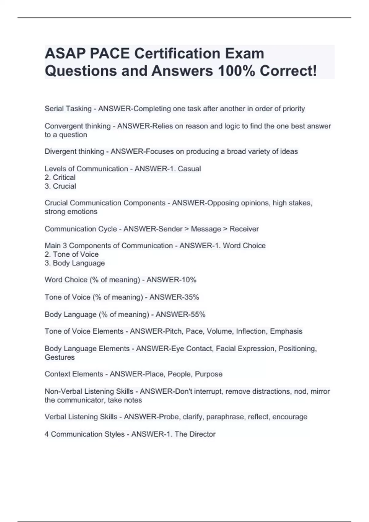 Serial Tasking - ANSWER-Completing one task after another in order of priority Convergent thinking - ANSWER-Relies on reason and logic to find the one best answer to a question Divergent thinking - ANSWER-Focuses on producing a broad variety of ideas Levels of Communication - ANSWER-1. Casual 2. Critical 3. Crucial Crucial Communication Components - ANSWER-Opposing opinions, high stakes, strong emotions Communication Cycle - ANSWER-Sender > Message > Receiver Main 3 Components of Communication - ANSWER-1. Word Choice 2. Tone of Voice 3. Body Language Word Choice (% of meaning) - ANSWER-10% Tone of Voice (% of meaning) - ANSWER-35% Body Language (% of meaning) - ANSWER-55% Tone of Voice Elements - ANSWER-Pitch, Pace, Volume, Inflection, Emphasis Body Language Elements - ANSWER-Eye Contact, Facial Expression, Positioning, Gestures Context Elements - ANSWER-Place, People, Purpose Non-Verbal Listening Skills - ANSWER-Don't interrupt, remove distractions, nod, mirror the communicator, take notes Verbal Listening Skills - ANSWER-Probe, clarify, paraphrase, reflect, encourage 4 Communication Styles - ANSWER-1. The Director 2. The Socializer 3