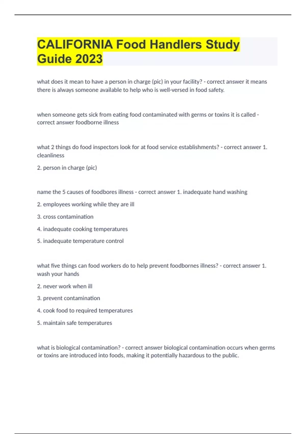 CALIFORNIA Food Handlers Study Guide 2023 what does it mean to have a person in charge (pic) in your facility? - correct answer it means there is always someone available to help who is well-versed in food safety. when someone gets sick from eating food contaminated with germs or toxins it is called - correct answer foodborne illness what 2 things do food inspectors look for at food service establishments? - correct answer 1. cleanliness 2. person in charge (pic) name the 5 causes of foodbores illness - correct answer 1. inadequate hand washing 2. employees working while they are ill 3. cross contamination 4. inadequate cooking temperatures 5. inadequate temperature control