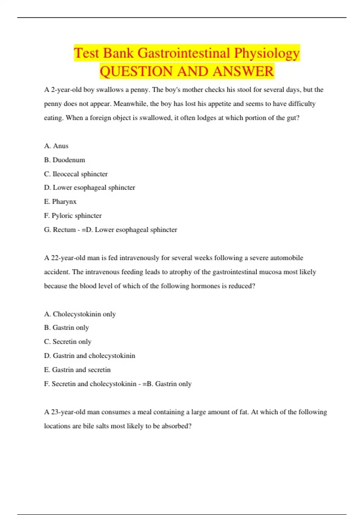 Test Bank Gastrointestinal Physiology QUESTION AND ANSWER
