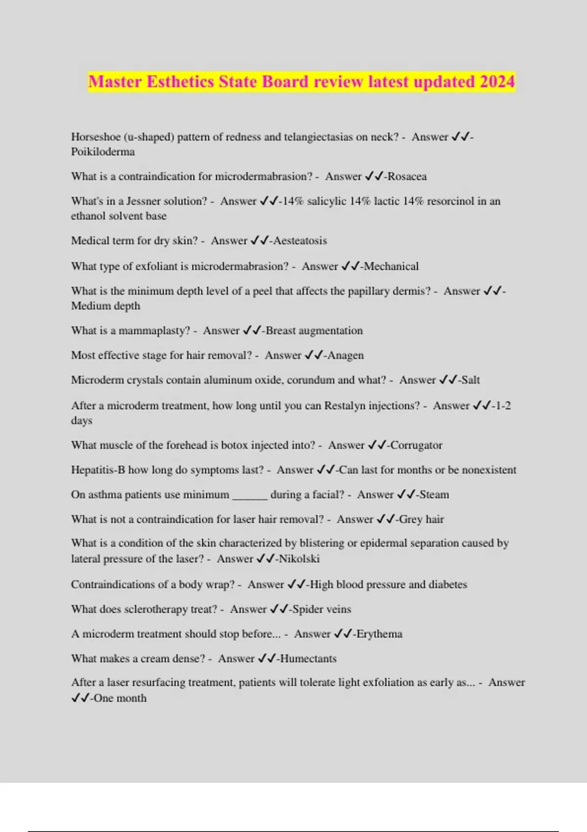 Master Esthetics State Board review latest updated 2024 Horseshoe (u-shaped) pattern of redness and telangiectasias on neck? - Answer ️️ - Poikiloderma What is a contraindication for microdermabrasion? - Answer ️️ -Rosacea What's in a Jessner solution? - Answer ️️ -14% salicylic 14% lactic 14% resorcinol in an ethanol solvent base Medical term for dry skin? - Answer ️️ -Aesteatosis What type of exfoliant is microdermabrasion? - Answer ️️ -Mechanical What is the minimum depth level of a peel that affects the papillary dermis? - Answer ️️ - Medium depth What is a mammaplasty? - Answer ️️ -Breast augmentation Most effective stage for hair removal? - Answer ️️ -Anagen Microderm crystals contain aluminum oxide, corundum and what? - Answer ️️ -Salt After a microderm treatment, how long until you can Restalyn injections? - Answer ️️ -1-2 days What muscle of the forehead is botox injected into? - Answer ️️ -Corrugator Hepatitis-B how long do symptoms last? - Answer ️️ -Can last for months or be nonexistent On asthma patients use minimum ______ during a facial? - Answer ️️ -Steam What is not a contraindication for laser hair removal? - Answer ️️ -Grey hair What is a condition of the skin characterized by blistering or epidermal separation caused by lateral pressure of the laser? - Answer ️️ -Nikolski Contraindications of a body wrap? - Answer ️️ -High blood pressure and diabetes What does sclerotherapy treat? - Answer ️️ -Spider veins A microderm treatment should stop before... - Answer ️️ -Erythema What makes a cream dense? - Answer ️️ -Humectants After a laser resurfacing treatment, patients will tolerate light exfoliation as early as... - Answer ️️ -One month Elastosis is what? - Answer ️️ -The breakdown of elastic tissue What is the medical teem for pregnancy mask? - Answer ️️ -Melasma Allergic reactions-- red, itchy eyes, ect. are caused by what? - Answer ️️ -Histamine What is the correct term for increased pigmentation? - Answer ️️ -Cholasma- liver spots Microcurrent does what? - Answer ️️ -Aids in healing and repairing in tissue, has ultra small amount of galvanic to stimulate the elasticity of the skin. What determines how many passes with microderm. a client can have? - Answer ️️ -Thickness of skin What is the cause of scabies? - Answer ️️ -Itch mite- parasites Which gland coordinates the production and release of hormones that travel to the pituitary gland from the base of the brain? - Answer ️️ -Hypothalamus When thinning of the skin, hair loss, and weight loss occur, what are these symptoms of? - Answer ️️ -Hyperthyroidism Syndrome cause by too much hydrocortisone production? - Answer ️️ -Cushing's syndrome What is the medical term for a wrinkle? - Answer ️️ -Rhytid Sphingolipids and glycolingolipids are what? - Answer ️️ -Ceramides- intercellular cement What is the technical term for excessive hair growth? - Answer ️️ -Hirsutism Where is reflexology performed? - Answer ️️ -Hands and fe