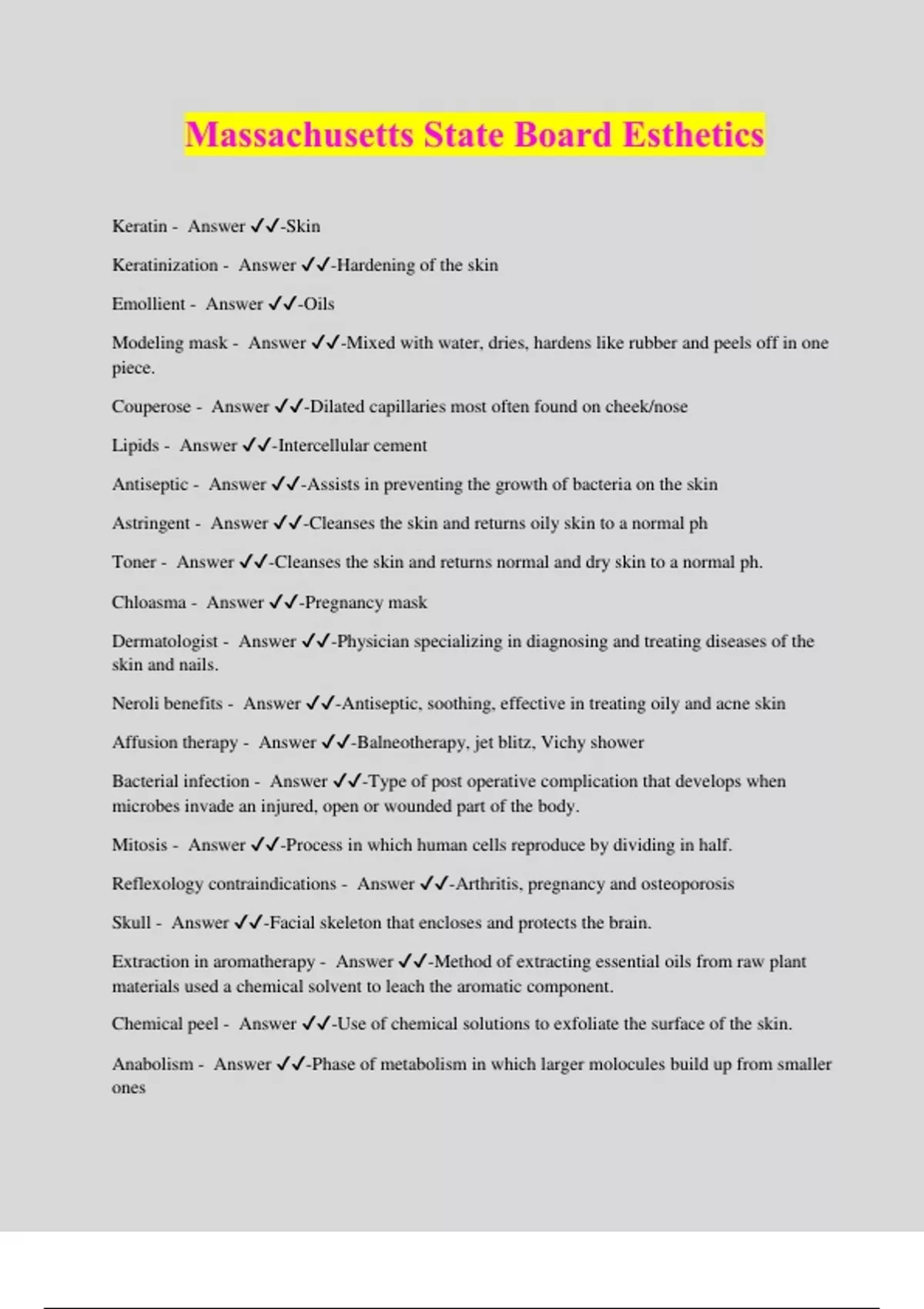 Massachusetts State Board Esthetics Keratin - Answer ️️ -Skin Keratinization - Answer ️️ -Hardening of the skin Emollient - Answer ️️ -Oils Modeling mask - Answer ️️ -Mixed with water, dries, hardens like rubber and peels off in one piece. Couperose - Answer ️️ -Dilated capillaries most often found on cheek/nose Lipids - Answer ️️ -Intercellular cement Antiseptic - Answer ️️ -Assists in preventing the growth of bacteria on the skin Astringent - Answer ️️ -Cleanses the skin and returns oily skin to a normal ph Toner - Answer ️️ -Cleanses the skin and returns normal and dry skin to a normal ph. Chloasma - Answer ️️ -Pregnancy mask Dermatologist - Answer ️️ -Physician specializing in diagnosing and treating diseases of the skin and nails. Neroli benefits - Answer ️️ -Antiseptic, soothing, effective in treating oily and acne skin Affusion therapy - Answer ️️ -Balneotherapy, jet blitz, Vichy shower Bacterial infection - Answer ️️ -Type of post operative complication that develops when microbes invade an injured, open or wounded part of the body. Mitosis - Answer ️️ -Process in which human cells reproduce by dividing in half. Reflexology contraindications - Answer ️️ -Arthritis, pregnancy and osteoporosis Skull - Answer ️️ -Facial skeleton that encloses and protects the brain. Extraction in aromatherapy - Answer ️️ -Method of extracting essential oils from raw plant materials used a chemical solvent to leach the aromatic component. Chemical peel - Answer ️️ -Use of chemical solutions to exfoliate the surface of the skin. Anabolism - Answer ️️ -Phase of metabolism in which larger molocules build up from smaller ones