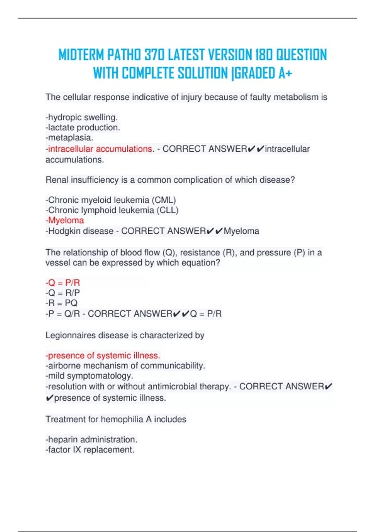 MIDTERM PATHO 370 LATEST VERSION 180 QUESTION WITH COMPLETE SOLUTION |GRADED A+ The cellular response indicative of injury because of faulty metabolism is -hydropic swelling. -lactate production. -metaplasia. -intracellular accumulations . - CORRECT ANSWER ✔✔intracellular accumulations. Renal insufficiency is a common complication of which disease? -Chronic myeloid leukemia (CML) -Chronic lymphoid leukemia (CLL) -Myeloma -Hodgkin disease - CORRECT ANSWER ✔✔Myelo ma The relationship of blood flow (Q), resistance (R), and pressure (P) in a vessel can be expressed by which equation? -Q = P/R -Q = R/P -R = PQ -P = Q/R - CORRECT ANSWER ✔✔Q = P/R Legionnaires disease is characterized by -presence of systemic illness. -airborne mechanism of communicability. -mild symptomatology. -resolution with or without antimicrobial therapy. - CORRECT ANSWER ✔