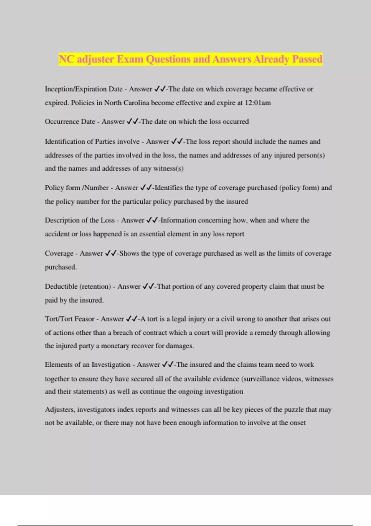 NC adjuster Exam Questions and Answers Already Passed Inception/Expiration Date - Answer ️️ -The date on which coverage became effective or expired. Policies in North Carolina become effective and expire at 12:01am Occurrence Date - Answer ️️ -The date on which the loss occurred Identification of Parties involve - Answer ️️ -The loss report should include the names and addresses of the parties involved in the loss, the names and addresses of any injured person(s) and the names and addresses of any witness(s) Policy form /Number - Answer ️️ -Identifies the type of coverage purchased (policy form) and the policy number for the particular policy purchased by the insured Description of the Loss - Answer ️️ -Information concerning how, when and where the accident or loss happened is an essential element in any loss report Coverage - Answer ️️ -Shows the type of coverage purchased as well as the limits of coverage purchased. Deductible (retention) - Answer ️️ -That portion of any covered property claim that must be paid by the insured. Tort/Tort Feasor - Answer ️️ -A tort is a legal injury or a civil wrong to another that arises out of actions other than a breach of contract which a court will provide a remedy through allowing the injured party a monetary recover for damages. Elements of an Investigation - Answer ️️ -The insured and the claims team need to work together to ensure they have secured all of the available evidence (surveillance videos, witnesses and their statements) as well as continue the ongoing investigation Adjusters, investigators index reports and witnesses can all be key pieces of the puzzle that may not be available, or there may not have been enough information to involve at the onset Statute of Limitations - Answer ️️ -Each state has its own statute of limitations laws. NC is three years Types of liability - Answer ️️ -Contributory, Vicarious, and Strict Contributory Liability - Answer ️️ -If a person was injured due to their own negligence (contributed to the accident), the injured party would not be entitled to collect any damages (money) from another party who supposedly caused the accident. (ex. person runs a red light and car hits them) Vicarious Liability - Answer ️️ -Someone is held responsible for the actions or omissions of another person while performing their employment duties (ex. employee fails to mop up a spill and a customer falls) Strict Liability - Answer ️️ -Liability incurred for causing damage to life, limb, or property by a hazardous activity or a defective product. ( toy company sells doll that injured a child are responsible even though they did not manufacture the doll) Damages - Answer ️️ -Special, General, and Punitive Special (compensatory) - Answer ️️ -Damages are amounts paid to compensate the plaintiff for direct expenses such as: medical treatment, loss wages, and funeral expenses (Can be measured) General (compensatory) - Answer ️️ -Damages are paid for losses that CANNOT be specifically measured and itemized in order to compensate the plaintiff such as: pain and suffering, loss of arm or leg, vision, and physical disfigurement. Punitive (punish) damages - Answer ️️ -are awarded to the plaintiff in addition to compensatory damages when the defendant's conduct has been malicious. They are awarded to punish the defendant and to deter others from committing similar actions Actual Cash Value (ACV) - Answer ️️ -is replacement cost at the time of loss less any depreciation Stated Value (stated amount) - Answer ️️ -is the maximum amount of insurance. The policy will still pay the actual cash value at the time of loss. If ACV is less than the state a