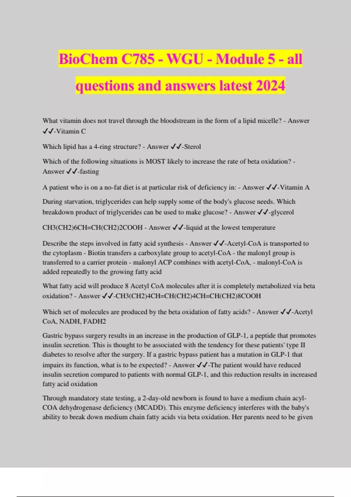 BioChem C785 - WGU - Module 5 - all questions and answers latest 2024 What vitamin does not travel through the bloodstream in the form of a lipid micelle? - Answer ️️ -Vitamin C Which lipid has a 4-ring structure? - Answer ️️ -Sterol Which of the following situations is MOST likely to increase the rate of beta oxidation? - Answer ️️ -fasting A patient who is on a no-fat diet is at particular risk of deficiency in: - Answer ️️ -Vitamin A During starvation, triglycerides can help supply some of the body's glucose needs. Which breakdown product of triglycerides can be used to make glucose? - Answer ️️ -glycerol CH3(CH2)6CH=CH(CH2)2COOH - Answer ️️ -liquid at the lowest temperature Describe the steps involved in fatty acid synthesis - Answer ️️ -Acetyl-CoA is transported to the cytoplasm - Biotin transfers a carboxylate group to acetyl-CoA - the malonyl group is transferred to a carrier protein - malonyl ACP combines with acetyl-CoA, - malonyl-CoA is added repeatedly to the growing fatty acid What fatty acid will produce 8 Acetyl CoA molecules after it is completely metabolized via beta oxidation? - Answer ️️ -CH3(CH2)4CH=CH(CH2)4CH=CH(CH2)8COOH Which set of molecules are produced by the beta oxidation of fatty acids? - Answer ️️ -Acetyl CoA, NADH, FADH2 Gastric bypass surgery results in an increase in the production of GLP-1, a peptide that promotes insulin secretion. This is thought to be associated with the tendency for these patients' type II diabetes to resolve after the surgery. If a gastric bypass patient has a mutation in GLP-1 that impairs its function, what is to be expected? - Answer ️️ -The patient would have reduced insulin secretion compared to patients with normal GLP-1, and this reduction results in increased fatty acid oxidation Through mandatory state testing, a 2-day-old newborn is found to have a medium chain acyl- COA dehydrogenase deficiency (MCADD). This enzyme deficiency interferes with the baby's ability to break down medium chain fatty acids via beta oxidation. Her parents need to be given