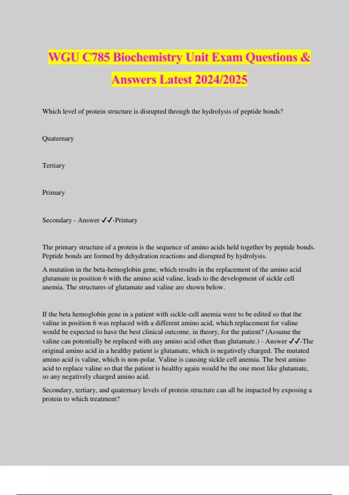 WGU C785 Biochemistry Unit Exam Questions & Answers Latest 2024/2025 Which level of protein structure is disrupted through the hydrolysis of peptide bonds? Quaternary Tertiary Primary Secondary - Answer ️️ -Primary The primary structure of a protein is the sequence of amino acids held together by peptide bonds. Peptide bonds are formed by dehydration reactions and disrupted by hydrolysis. A mutation in the beta-hemoglobin gene, which results in the replacement of the amino acid glutamate in position 6 with the amino acid valine, leads to the development of sickle cell anemia. The structures of glutamate and valine are shown below. If the beta hemoglobin gene in a patient with sickle-cell anemia were to be edited so that the valine in position 6 was replaced with a different amino acid, which replacement for valine would be expected to have the best clinical outcome, in theory, for the patient? (Assume the valine can potentially be replaced with any amino acid other than glutamate.) - Answer ️️ -The original amino acid in a healthy patient is glutamate, which is negatively charged. The mutated amino acid is valine, which is non-polar. Valine is causing sickle cell anemia. The best amino acid to replace valine so that the patient is healthy again would be the one most like glutamate, so any negatively charged amino acid. Secondary, tertiary, and quaternary levels of protein structure can all be impacted by exposing a protein to which treatment? Change of a hydrophobic amino acid to a different hydrophobic amino acid Addition of a reducing agent Placement of the protein in a solution with a low pH Increase in the concentration of the protein in solution - Answer ️️ -Placement of the protein in a solution with a low pH Changes in pH affect hydrogen bonds and ionic bonds. Hydrogen bonds in the backbone of amino acids occur in secondary structure, and both hydrogen bonds and ionic bonds occur in the side chains of amino acids in tertiary structure. An increase in beta-pleated sheet structure in some brain proteins can lead to an increase in amyloid deposit formation, characteristic of some neurodegenerative diseases. What is the primary biochemical process that follows the increase in beta-pleated sheet structure that leads to the development of the amyloid deposits? An increase in glycogen formation in the brain cells Aggregation of the proteins in the brain Secretion of glucagon, leading to excessive ketogenesis An increase in anaerobic metabolism of glucose in the brain - Answer ️️ -Aggregation of the proteins in the brain This question is describing changes in protein structure. Aggregation occurs when proteins clump together inappropriately, causing plaques like amyloid deposits to accumulate. Which level of protein structure is determined by the sequence of amino acids? Secondary structure Quaternary structure Tertiary structure Primary structure - Answer ️️ -Primary structure The primary structure of a protein is simply the sequence of amino acids held together by peptide bonds. Which force is most influential in determining the secondary structure of a protein? Hydrophobic effect Disulfide bonding Hydrogen bonding Electrostatic interactions - Answer ️️ -Hydrogen bonding The secondary structure of a protein is built by hydrogen bonds between the carboxyl groups and amino groups on the backbones of the amino acids. Which amino acid would most likely participate in hydrogen bonds? - Answer ️️ -Amino Acid structure 4 This is a polar, uncharged amino acid due to the OH group on the side chain. Polar, uncharged amino acids containing oxygen or NH groups make hydrogen bonds. Which portion of the amino acid is inside the box? The box is surrounding the section below the Alpha Carbon - Answer ️️ -Side Chain The side chain is the variable group of the amino acid, also called the R group. Every amino acid has the same amino group, carboxylic acid group, and an alpha carbon, but the side chain is different. Which pair of amino acids will most likely interact through hydrophobic forces between their side chains? - Answer ️️ -Both of these amino acids are non-polar and therefore can interact together with a hydrophobic interaction. Please note that the "S" in the amino acid on the right is non-polar, while the "SH" group in answer choice D is polar. The S must have an H to be polar and is otherwise non-polar. Which portion of the amino acid is inside the box? The box is over the Carbon at the Center of the chain - Answer ️️ -Alpha Carbon The alpha carbon is the central carbon on an amino acid that holds together the other groups of the amino acid. It is always attached to the amino group, the carboxyl group, the side chain, and a single hydrogen. It is part of the backbone of the amino acid and is found in every amino acid. Given the following amino acid structure, what is the strongest intermolecular force it would participate in to stabilize a protein structure? Ionic bond Disulfide bond Hydrogen bond Hydrophobic interaction - Answer ️️ -Hydrophobic interaction The amino acid pictured only has CH groups in its side chain, and therefore is non-polar. Non- polar amino acids make hydrophobic interactions. Which change would most likely result in a permanent modification of an expressed protein's function? An increase in the pH of a solution in which a protein is dissolved from 6.5 to 8.0, when it is known that the protein has an optimal activity of pH 7.8 A mutation of the gene for a protein that leads to the substitution of a hydrophobic amino acid with a nonpolar amino acid A mutation of the gene for a protein that leads to the substitution of a nonpolar amino acid with a charged amino acid The mutation of a gene for an enzyme involved in protein synthesis following exposure to X- rays, causing the protein not to be synthesized - Answer ️️ -A mutation of the gene for a protein that leads to the substitution of a nonpolar amino acid with a charged amin
