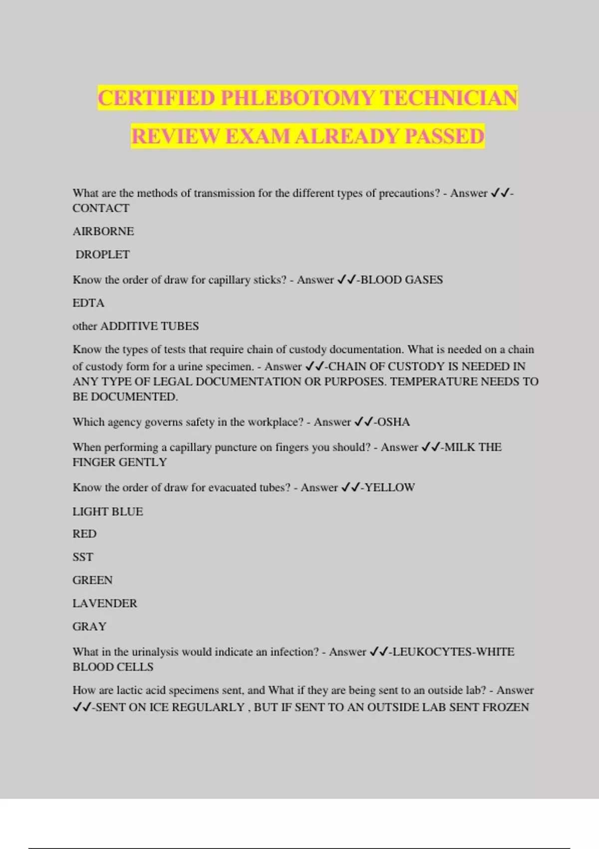 CERTIFIED PHLEBOTOMY TECHNICIAN REVIEW EXAM ALREADY PASSED What are the methods of transmission for the different types of precautions? - Answer ️️ - CONTACT AIRBORNE DROPLET Know the order of draw for capillary sticks? - Answer ️️ -BLOOD GASES EDTA other ADDITIVE TUBES Know the types of tests that require chain of custody documentation. What is needed on a chain of custody form for a urine specimen. - Answer ️️ -CHAIN OF CUSTODY IS NEEDED IN ANY TYPE OF LEGAL DOCUMENTATION OR PURPOSES. TEMPERATURE NEEDS TO BE DOCUMENTED. Which agency governs safety in the workplace? - Answer ️️ -OSHA When performing a capillary puncture on fingers you should? - Answer ️️ -MILK THE FINGER GENTLY Know the order of draw for evacuated tubes? - Answer ️️ -YELLOW LIGHT BLUE RED SST GREEN LAVENDER GRAY What in the urinalysis would indicate an infection? - Answer ️️ -LEUKOCYTES-WHITE BLOOD CELLS How are lactic acid specimens sent, and What if they are being sent to an outside lab? - Answer ️️ -SENT ON ICE REGULARLY , BUT IF SENT TO AN OUTSIDE LAB SENT FROZEN Can a patient eat or drink anything but water before a fasting blood test? And how long does patients need to fast? - Answer ️️ -NO, for 8-12 HRS Why are there 2 different colored caps on collection bottles? - Answer ️️ -BLOOD CULTURES ANAEROBIC AND AEROBIC TO DETECT MICROORGANISMS IN THE BLOOD According to CLSI standards what is the first vein you must attempt to find on either arm? - Answer ️️ -MEDIAN CUBITAL VEIN Why do Point of Care test regulations require quality control? Also remember to document Quality control results. - Answer ️️ -TO ENSURE ACCURATE RESULTS Failure to demonstrate proper care with injury is - Answer ️️ -NEGLIGENCE Why should the phlebotomist explain the procedure prior to venipuncture? - Answer ️️ -TO GET CONSENT Drawing a patient's blood without consent would be? - Answer ️️ -BATTERY Can a stool specimen be collected with urine? - Answer ️️ -NO Easiest vein to find on an obese patient? - Answer ️️ -CEPHALIC VEIN THUMB SIDE Why should you avoid using a site with interrupted skin integrity? - Answer ️️ -INCREASES CHANCES OF INFECTION Why do you need to place the label of a non blood specimen on the container, not the lid?. - Answer ️️ -BECAUSE IF YOU TOOK THE LID OFF OF IT WOULD BE AN UNLABELED SPECIMEN. CBC, Chemistry panel, lead, and toxicology screen via capillary puncture, which tube would be first? - Answer ️️ -LAVENDER EDTA TUBE Proper way to ID newborn? - Answer ️️ -ID BRACELET STAT chemistry panel, What color Tube? - Answer ️️ -Green tube if needed STAT PT/PTT goes in what color tube? - Answer ️️ -LIGHT BLUE FOR ALL COAGULATION TEST Which tubes are centrifuged for serum specimen? - Answer ️️ -SST TUBES RED SPECKLED GOLD Capillary finger puncture can be done on which fingers? Should the puncture go along the fingerprint or perpendicular to it? - Answer ️️ -RING and MIDDLE FINGER PERPENDICULAR TO THE FINGERPRINT How would you instruct a female to collect a urine specimen for a culture? - Answer ️️ -Do a clean catch specimen, Wipe front to back, and collect specimen midstream. Hematomas are more likely in what age group? - Answer ️️ -ELDERLY What is the most common complication of phlebotomy for a patient on warfarin Coumadin? - Answer ️️ -HEMATOMAS What would you use to clean blood or body fluids off a hard surface? - Answer ️️ -ANTI MICROBIAL SOAPS OR WIPES What are the handling requirements for a bilirubin and vitamin levels Test? - Answer ️️ - MUST BE COVERED FROM THE SUNLIGHT DRAWN IN AN AMBER TUBE. What is the accepted angle for needle insertion in the antecubital space? And which way should the bevel be facing? - Answer ️️ -15-30 DEGREES BEVEL UP EDTA and blood culture tubes should be inverted how many times? - Answer ️️ -8-10 times Which of the following would exclude a person from donating blood? age race obesity gender - Answer ️️ -AGE Why is it important to make sure a light blue sodium citrate tube is a full draw? - Answer ️️ - To get an accurate result Which blood component is necessary for clotting (which type of blood cell)? - Answer ️️ - Thrombocyte PLATELETS When do you label a specimen? - Answer ️️ -After you d