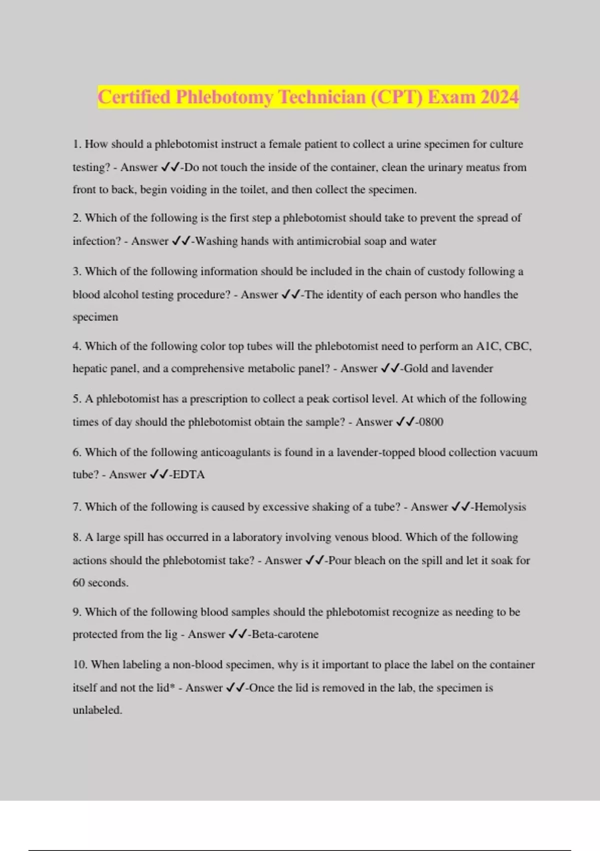 Certified Phlebotomy Technician (CPT) Exam 2024 1. How should a phlebotomist instruct a female patient to collect a urine specimen for culture testing? - Answer ️️ -Do not touch the inside of the container, clean the urinary meatus from front to back, begin voiding in the toilet, and then collect the specimen. 2. Which of the following is the first step a phlebotomist should take to prevent the spread of infection? - Answer ️️ -Washing hands with antimicrobial soap and water 3. Which of the following information should be included in the chain of custody following a blood alcohol testing procedure? - Answer ️️ -The identity of each person who handles the specimen 4. Which of the following color top tubes will the phlebotomist need to perform an A1C, CBC, hepatic panel, and a comprehensive metabolic panel? - Answer ️️ -Gold and lavender 5. A phlebotomist has a prescription to collect a peak cortisol level. At which of the following times of day should the phlebotomist obtain the sample? - Answer ️️ -0800 6. Which of the following anticoagulants is found in a lavender-topped blood collection vacuum tube? - Answer ️️ -EDTA 7. Which of the following is caused by excessive shaking of a tube? - Answer ️️ -Hemolysis 8. A large spill has occurred in a laboratory involving venous blood. Which of the following actions should the phlebotomist take? - Answer ️️ -Pour bleach on the spill and let it soak for 60 seconds. 9. Which of the following blood samples should the phlebotomist recognize as needing to be protected from the lig - Answer ️️ -Beta-carotene 10. When labeling a non-blood specimen, why is it important to place the label on the container itself and not the lid* - Answer ️️ -Once the lid is removed in the lab, the specimen is unlabeled. 11. At the completion of a routine venipuncture, a phlebotomist incurs a needlestick to her finger. What information should she include on the required post-accident form for this situation? - Answer ️️ -The type of blood collection device used 12. A phlebotomist touches a patient's arm and begins to perform venipuncture before obtaining consent from the patient. Which of the following torts has the phlebotomist committed? - Answer ️️ -Battery 13. When performing a 3-hr glucose tolerance test, a phlebotomist should verify the patient has fasted for which of the following required lengths or time? - Answer ️️ -8 to 12 hr 14. A phlebotomist has duplicate orders for a patient. How should the order be verifled? - Answer ️️ -Call the provider to confirm the test requisition for the patient. 15. A phlebotomist has just confirmed critical values on a laboratory test. Which of the following actions should the phlebotomist take when the physician's office is already closed? - Answer ️️ -Fax the results to the physician's office with a stat fax cover. 16. A phlebotomist is asked to verify the temperature of a urine specimen for chain of custody procedure. Which o Раз 114 following temperatures is an acceptable measurement for this specimen? - - Answer ️️ -35° C (95° F) 17. When using a butterfly needle for venipuncture on dorsal hand veins, which of the following actions should the phlebotomist take? - Answer ️️ -B. Hold the needle by the wings of the butterfly. 18. Point the care test regulation require quality control to - Answer ️️ -A. Ensure accuracy of test results. (garantizar la exactitud de los resultados) 19. Which of the following information should a phlebotomist document for a blood culture collection? - Answer ️️ -C. Site of collecti