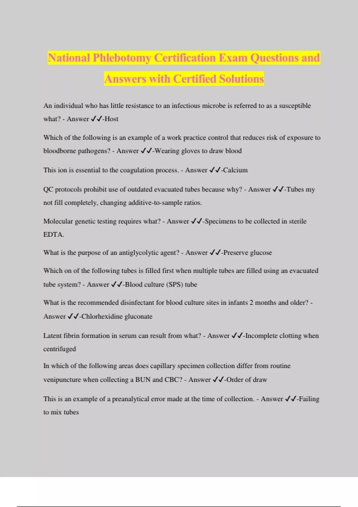 National Phlebotomy Certification Exam Questions and Answers with Certified Solutions An individual who has little resistance to an infectious microbe is referred to as a susceptible what? - Answer ️️ -Host Which of the following is an example of a work practice control that reduces risk of exposure to bloodborne pathogens? - Answer ️️ -Wearing gloves to draw blood This ion is essential to the coagulation process. - Answer ️️ -Calcium QC protocols prohibit use of outdated evacuated tubes because why? - Answer ️️ -Tubes my not fill completely, changing additive-to-sample ratios. Molecular genetic testing requires what? - Answer ️️ -Specimens to be collected in sterile EDTA. What is the purpose of an antiglycolytic agent? - Answer ️️ -Preserve glucose Which on of the following tubes is filled first when multiple tubes are filled using an evacuated tube system? - Answer ️️ -Blood culture (SPS) tube What is the recommended disinfectant for blood culture sites in infants 2 months and older? - Answer ️️ -Chlorhexidine gluconate Latent fibrin formation in serum can result from what? - Answer ️️ -Incomplete clotting when centrifuged In which of the following areas does capillary specimen collection differ from routine venipuncture when collecting a BUN and CBC? - Answer ️️ -Order of draw This is an example of a preanalytical error made at the time of collection. - Answer ️️ -Failing to mix tubes What constitutes a positive modified Allen test? - Answer ️️ -The hand color returns to normal in 15 seconds. According to CLSI, which tubes should be placed upright as soon as they are mixed? - Answer ️️ -Nonanticoagulant gel tubes Reference values are higher for capillary specimens with what test? - Answer ️️ -Glucose According to CLSI, the maximum time limit for separating serum or plasma from cells is how long? - Answer ️️ -2.0 hours from time of collection All of the following are a reason for transporting tubes with the stoppers up EXCEPT which of the following? - Answer ️️ -Maintains the sterility of the sample. The liquid portion of a clotted specimen is called what? - Answer ️️ -Serum The most common reason for glucose monitoring through POCT is to what? - Answer ️️ - Monitor glucose levels for diabetic care. The AMT, ACA, and ASCP are agencies that do what? - Answer ️️ -Certify laboratory profession