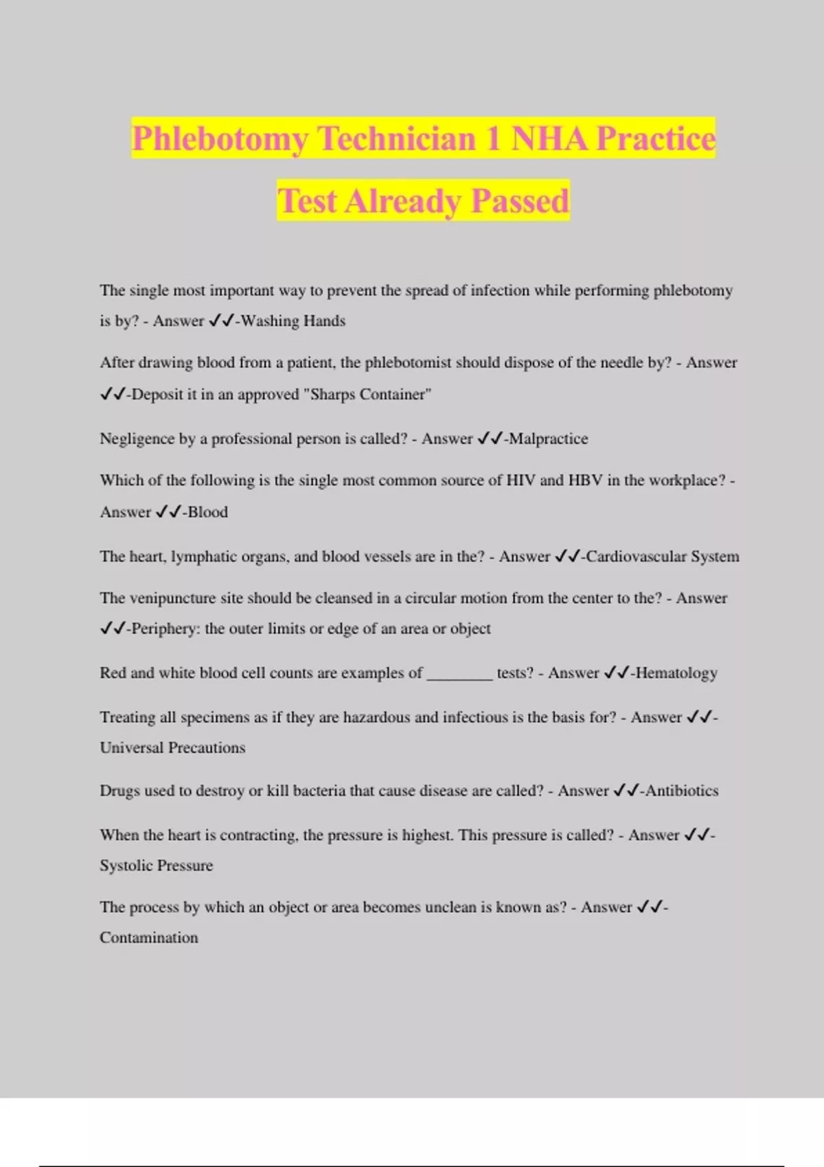 Phlebotomy Technician 1 NHA Practice Test Already Passed