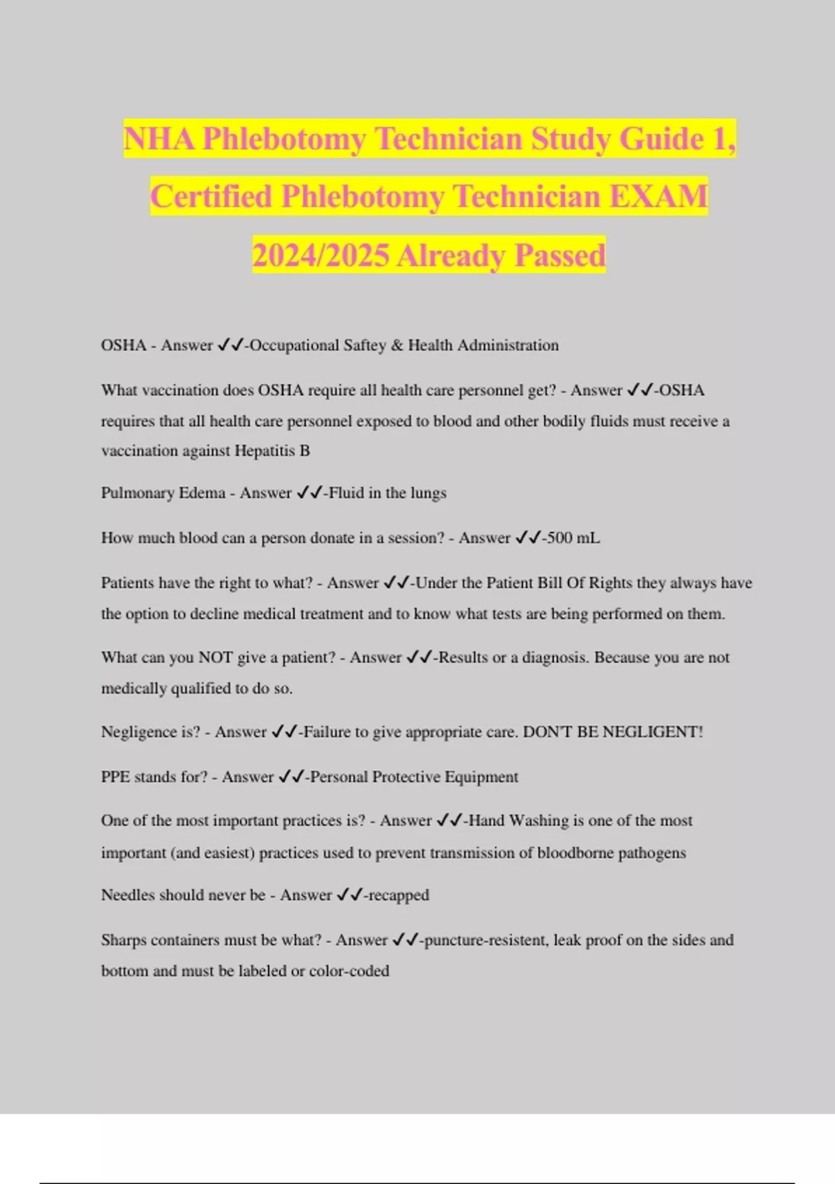 NHA Phlebotomy Technician Study Guide 1, Certified Phlebotomy Technician EXAM 2024/2025 Already Passed OSHA - Answer ️️ -Occupational Saftey & Health Administration What vaccination does OSHA require all health care personnel get? - Answer ️️ -OSHA requires that all health care personnel exposed to blood and other bodily fluids must receive a vaccination against Hepatitis B Pulmonary Edema - Answer ️️ -Fluid in the lungs How much blood can a person donate in a session? - Answer ️️ -500 mL Patients have the right to what? - Answer ️️ -Under the Patient Bill Of Rights they always have the option to decline medical treatment and to know what tests are being performed on them. What can you NOT give a patient? - Answer ️️ -Results or a diagnosis. Because you are not medically qualified to do so. Negligence is? - Answer ️️ -Failure to give appropriate care. DON'T BE NEGLIGENT! PPE stands for? - Answer ️️ -Personal Protective Equipment One of the most important practices is? - Answer ️️ -Hand Washing is one of the most important (and easiest) practices used to prevent transmission of bloodborne pathogens Needles should never be - Answer ️️ -recapped Sharps containers must be what? - Answer ️️ -puncture-resistent, leak proof on the sides and bottom and must be labeled or color-coded Types of Hazards - Answer ️️ -Biologic - Infectious agents that can cause bacterial, viral, fungal or parasitic infections Sharps - Needles, lancets and broken glass can puncture and cut, causing blood-borne pathogen exposure Chemical - Preservatives and chemicals used in the laboratory. Exposure to Toxin, Carcinogenic or caustic substances Fire or explosive - bunsen burners, oxygen and chemicals can cause burns or dismemberment Physical - wet floors, heavy lifting ance cause falls, sprains and strains * ALLERGIC reaction ** - Latex sensitivity is a PHYSICAL reaction to care worker allergic reation to the patient In infection control WHO is the agent? - Answer ️️ -Person In infection control WHAT is portal of exit? - Answer ️️ -Needle In infection control WHAT can we control? - Answer ️️ -Mode Of Transmission OR exit of infection In infection control WHAT is a portal of entry? - Answer ️️ -Mucas membrane In infection control WHO is a susceptible host? - Answer ️️ -Person Mode of Transmission - Answer ️️ -Specific ways in which microorganisms travel from the reservoir to the suseptible host Five main types or mode of transmission - Answer ️️ -contact - direct and indirect (fomite) Droplet - Cold, Flu and sneezing Airborne - viral - breath in common vehicle - person, fomite and not handwashing vector borne - illness that is transmitted through an invertebrate, such as an insect Mode of infection - Answer ️️ -the point in the infection chain where we aim at preventing the spread of infectious disease Standard precautions do what? - Answer ️️ -Infection control method designed to prevent direct contact with blood and other body fluids and tissues by using a barrier of protection and work control practices. What do we assume all patients to be? - Answer ️️ -Patients are presumed to be infective for blood-borne pathogens Standard precautions consist of what itmes? - Answer ️️ -Gloves - when collecting and handling body fluids, or tissue specimen Face shield - when danger of splashing on mucous membranes Disposal - dispose of all needles and sharp objests in punture-proof containers, WITH OUT RECAPPING Disinfectants - clean fluid spills, thus killing pathogenic organisms Medical Asepsis - Answer ️️ -This condition is best defined as "the destruction of pathogenic microorganisms after they leave the body". It also involves enviromental hygien measures such as equipment cleaning and disinfection procedures. Methods of medical asepsis are Standard Precautions and Transmission-based Precautions What are barrier protections? - Answer ️️ -Masks Gloves Face Shields Resirator Gloves How do you remove PPE equipment? - Answer ️️ -1st - Gloves 2nd - Gown 3rd - Shield What type of soap should be used? - Answer ️️ -Non-abrasive, antibacterial soap. What do you do if blood splashes in the eye or mucous membane? - Answer ️️ -Flush with warm water (hotter the better) for 15 minutes Report incident exposure to your supervisor ASAP! Who cannot be identified in an incident report? - Answer ️️ -a minor Bedside manner includes? - Answer ️️ -introduce yourself, ask patient name and b-day. Explain what you will be doing. Chat with patient to keep mind off poke. ADVISE them WHEN you are poking! Speak to them on a first name basis What phase is best practice - Answer ️️ -"pleasant with the patient and professional with the poke". If patient has an I.V. where do you draw blood? - Answer ️️ -Downstream from the I.V. Double Mastectomy patients should ONLY have blood drawn from what? - Answer ️️ -Hands Left Mastectomy patients should have blood drawn from what side? - Answer ️️ -Right side What is a Fistula? - Answer ️️ -artificial connections of veins What is a Graft? - Answer ️️ -artificial artery connection to vein Sclerosis is? - Answer ️️ -Hard and cord like
