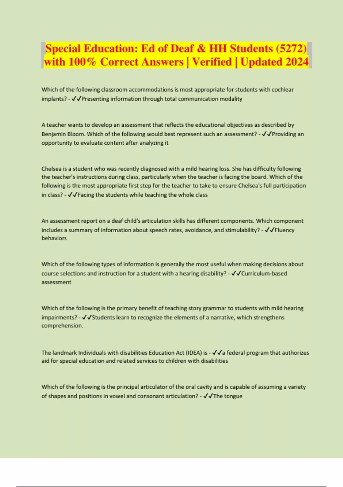 Special Education: Ed of Deaf & HH Students (5272) with 100% Correct Answers | Verified | Updated 2024