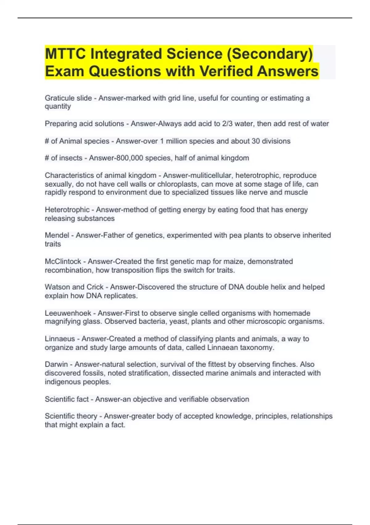 Graticule slide - Answer-marked with grid line, useful for counting or estimating a quantity Preparing acid solutions - Answer-Always add acid to 2/3 water, then add rest of water # of Animal species - Answer-over 1 million species and about 30 divisions # of insects - Answer-800,000 species, half of animal kingdom Characteristics of animal kingdom - Answer-muliticellular, heterotrophic, reproduce sexually, do not have cell walls or chloroplasts, can move at some stage of life, can rapidly respond to environment due to specialized tissues like nerve and muscle Heterotrophic - Answer-method of getting energy by eating food that has energy releasing substances Mendel - Answer-Father of genetics, experimented with pea plants to observe inherited traits McClintock - Answer-Created the first genetic map for maize, demonstrated recombination, how transposition flips the switch for traits. Watson and Crick - Answer-Discovered the structure of DNA double helix and helped explain how DNA replicates. Leeuwenhoek - Answer-First to observe single celled organisms with homemade magnifying glass. Observed bacteria, yeast, plants and other microscopic organisms. Linnaeus - Answer-Created a method of classifying plants and animals, a way to organize and study large amounts of data, called Linnaean taxonomy. Darwin - Answer-natural selection, survival of the fittest by observing finches. Also discovered fossils, noted stratification, dissected marine animals and interacted with indigenous peoples. Scientific fact - Answer-an objective and verifiable observation Scientific theory - Answer-greater body of accepted knowledge, principles, relationships that might explain a fact.