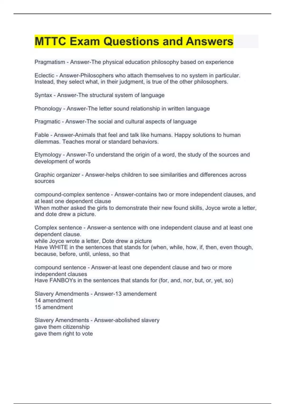 Pragmatism - Answer-The physical education philosophy based on experience Eclectic - Answer-Philosophers who attach themselves to no system in particular. Instead, they select what, in their judgment, is true of the other philosophers. Syntax - Answer-The structural system of language Phonology - Answer-The letter sound relationship in written language Pragmatic - Answer-The social and cultural aspects of language Fable - Answer-Animals that feel and talk like humans. Happy solutions to human dilemmas. Teaches moral or standard behaviors. Etymology - Answer-To understand the origin of a word, the study of the sources and development of words Graphic organizer - Answer-helps children to see similarities and differences across sources compound-complex sentence - Answer-contains two or more independent clauses, and at least one dependent clause When mother asked the girls to demonstrate their new found skills, Joyce wrote a letter, and dote drew a picture. Complex sentence - Answer-a sentence with one independent clause and at least one dependent clause. while Joyce wrote a letter, Dote drew a picture Have WHITE in the sentences that stands for (when, while, how, if, then, even though, because, before, until, unless, so that compound sentence - Answer-at least one dependent clause and two or more independent clauses Have FANBOYs in the sentences that stands for (for, and, nor, but, or, yet, so) Slavery Amendments - Answer-13 amendement 14 amendment 15 amendment Slavery Amendments - Answer-abolished slavery gave them citizenship gave them right to vote