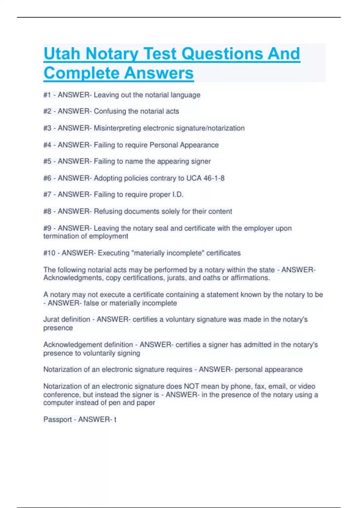 Utah Notary Test Questions And Complete Answers #1 - ANSWER- Leaving out the notarial language #2 - ANSWER- Confusing the notarial acts #3 - ANSWER- Misinterpreting electronic signature/notarization #4 - ANSWER- Failing to require Personal Appearance #5 - ANSWER- Failing to name the appearing signer #6 - ANSWER- Adopting policies contrary to UCA 46-1-8 #7 - ANSWER- Failing to require proper I.D. #8 - ANSWER- Refusing documents solely for their content #9 - ANSWER- Leaving the notary seal and certificate with the employer upon termination of employment #10 - ANSWER- Executing "materially incomplete" certificates The following notarial acts may be performed by a notary within the state - ANSWERAcknowledgments, copy certifications, jurats, and oaths or affirmations. A notary may not execute a certificate containing a statement known by the notary to be - ANSWER- false or materially incomplete Jurat definition - ANSWER- certifies a voluntary signature was made in the notary's presence Acknowledgement definition - ANSWER- certifies a signer has admitted in the notary's presence to voluntarily signing Notarization of an electronic signature requires - ANSWER- personal appearance Notarization of an electronic signature does NOT mean by phone, fax, email, or video conference, but instead the signer is - ANSWER- in the presence of the notary using a computer instead of pen and paper Passport - ANSWER- t I.D. from the government (U.S., any state within the U.S., or Foreign) with the following three items: - ANSWER- Photograph, signature, physical description Driver's privilege card - ANSWER- f Birth certificate - ANSWER- f Marriage license - ANSWER- f Social security card - ANSWER- f For every notarial act, the notary may record the following information in the journal - ANSWER- a description of the document or proceeding A notary may not - ANSWER- refuse to enter into a lawful transaction The notary's official seal and journal are exclusive property of the notary and cannot be used by any other person - ANSWER- t Include where the notarization took place - ANSWER- t The notarial certificate includes - ANSWER- venue, notarial act, signature, seal, commission expiration, residence Copy certification definition - ANSWER- certifies a photocopy is an accurate copy and is not a public record or p