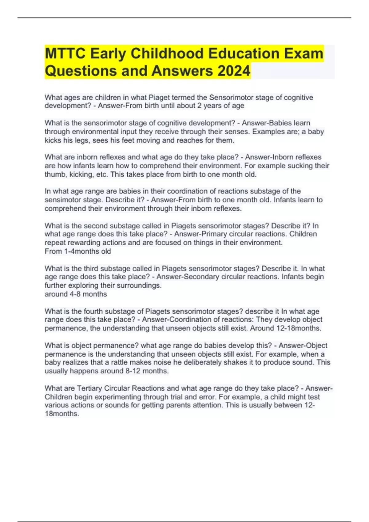 What ages are children in what Piaget termed the Sensorimotor stage of cognitive development? - Answer-From birth until about 2 years of age What is the sensorimotor stage of cognitive development? - Answer-Babies learn through environmental input they receive through their senses. Examples are; a baby kicks his legs, sees his feet moving and reaches for them. What are inborn reflexes and what age do they take place? - Answer-Inborn reflexes are how infants learn how to comprehend their environment. For example sucking their thumb, kicking, etc. This takes place from birth to one month old. In what age range are babies in their coordination of reactions substage of the sensimotor stage. Describe it? - Answer-From birth to one month old. Infants learn to comprehend their environment through their inborn reflexes. What is the second substage called in Piagets sensorimotor stages? Describe it? In what age range does this take place? - Answer-Primary circular reactions. Children repeat rewarding actions and are focused on things in their environment. From 1-4months old What is the third substage called in Piagets sensorimotor stages? Describe it. In what age range does this take place? - Answer-Secondary circular reactions. Infants begin further exploring their surroundings. around 4-8 months What is the fourth substage of Piagets sensorimotor stages? describe it In what age range does this take place? - Answer-Coordination of reactions: They develop object permanence, the understanding that unseen objects still exist. Around 12-18months. What is object permanence? what age range do babies develop this? - Answer-Object permanence is the understanding that unseen objects still exist. For example, when a baby realizes that a rattle makes noise he deliberately shakes it to produce sound. This usually happens around 8-12 months. What are Tertiary Circular Reactions and what age range do they take place? - Answer-Children begin experimenting through trial and error. For example, a child might test various actions or sounds for getting parents attention. This is usually between 12-18months.