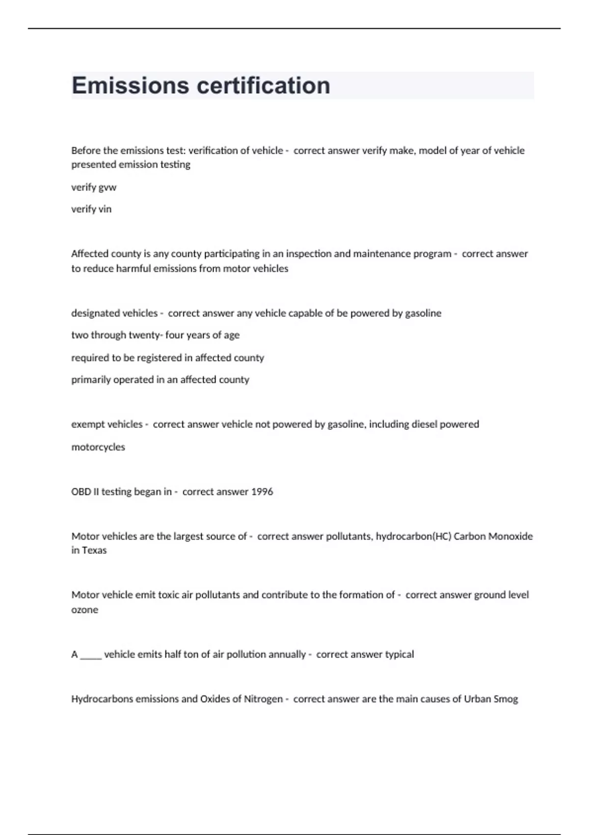Emissions certificationBefore the emissions test: verification of vehicle - correct answer verify make, model of year of vehicle presented emission testing verify gvw verify vin Affected county is any county participating in an inspection and maintenance program - correct answer to reduce harmful emissions from motor vehicles designated vehicles - correct answer any vehicle capable of be powered by gasoline two through twenty- four years of age required to be registered in affected county primarily operated in an affected county exempt vehicles - correct answer vehicle not powered by gasoline, including diesel powered motorcycles OBD II testing began in - correct answer 1996 Motor vehicles are the largest source of - correct answer pollutants, hydrocarbon(HC) Carbon Monoxide in Texas Motor vehicle emit toxic air pollutants and contribute to the formation of - correct answer ground level ozone A ____ vehicle emits half ton of air pollution annually - correct answer typical Hydrocarbons emissions and Oxides of Nitrogen - correct answer are the main causes of Urban Smog