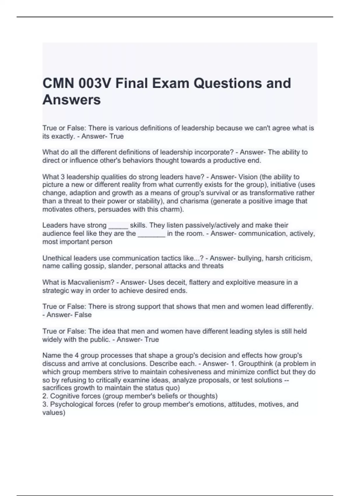 CMN 003V Final Exam Questions and Answers