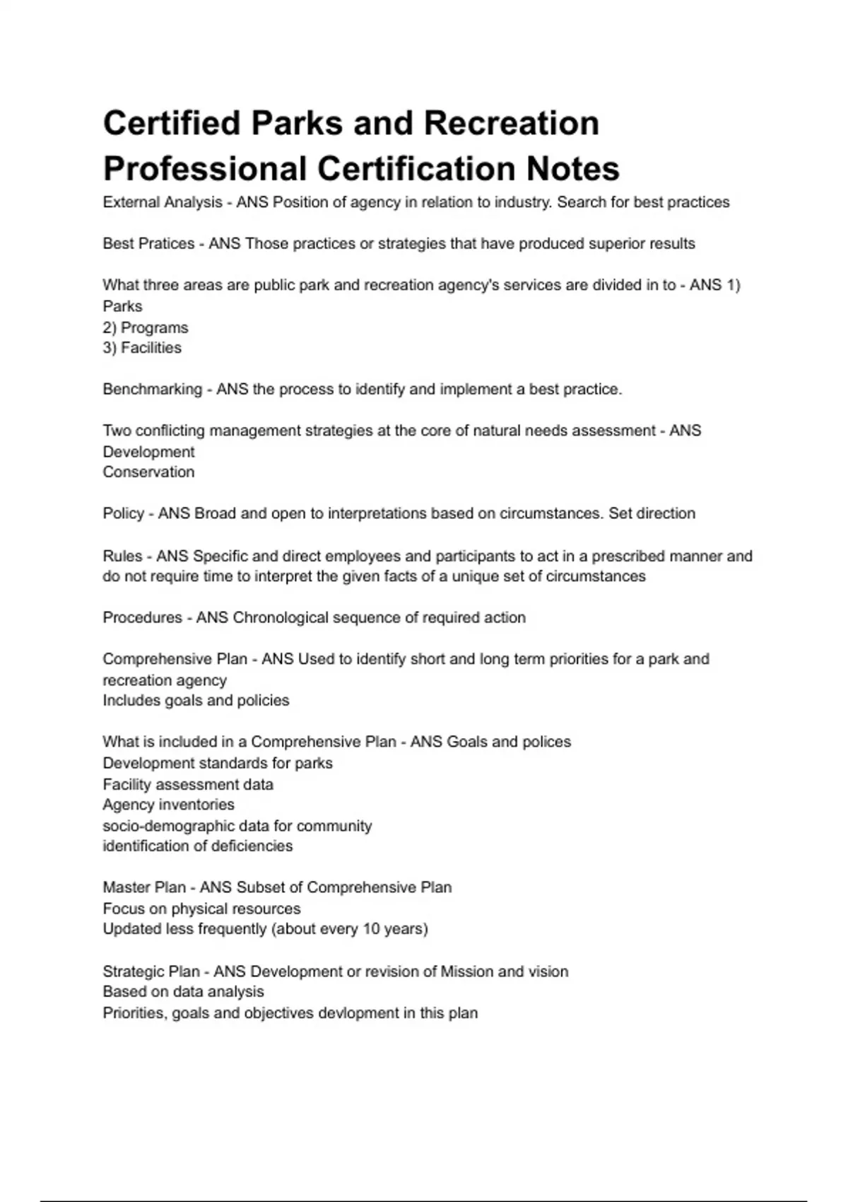 Certified Parks and Recreation Professional Certification Notes A+ GRADED Q&A External Analysis - ANS Position of agency in relation to industry. Search for best practices Best Pratices - ANS Those practices or strategies that have produced superior results What three areas are public park and recreation agency's services are divided in to - ANS 1) Parks 2) Programs 3) Facilities Benchmarking - ANS the process to identify and implement a best practice. Two conflicting management strategies at the core of natural needs assessment - ANS Development Conservation Policy - ANS Broad and open to interpretations based on circumstances. Set direction Rules - ANS Specific and direct employees and participants to act in a prescribed manner and do not require time to interpret the given facts of a unique set of circumstances Procedures - ANS Chronological sequence of required action Comprehensive Plan - ANS Used to identify short and long term priorities for a park and recreation agency Includes goals and policies What is included in a Comprehensive Plan - ANS Goals and polices Development standards for parks Facility assessment data Agency inventories socio-demographic data for community identification of deficiencies Master Plan - ANS Subset of Comprehensive Plan Focus on physical resources Updated less frequently (about every 10 years) Strategic Plan - ANS Development or revision of Mission and vision Based on data analysis Priorities, goals and objectives devlopment in this plan Plan for achieving goals and objectives Itemized inventory - ANS Checklist of items that describe their Two conflicting management strategies (core of a natural needs assessment) - ANS Development and conservation Needs Assessment' purpose - ANS to provide accurate feedback on community attitudes, opinions and perceptions of the agency's resources Community-wide needs assessment - ANS Used to identify the recreation needs and interests of the community. Americans with Disabilities Act requires - ANS That reasonable accommodations be provided for people with disabilities