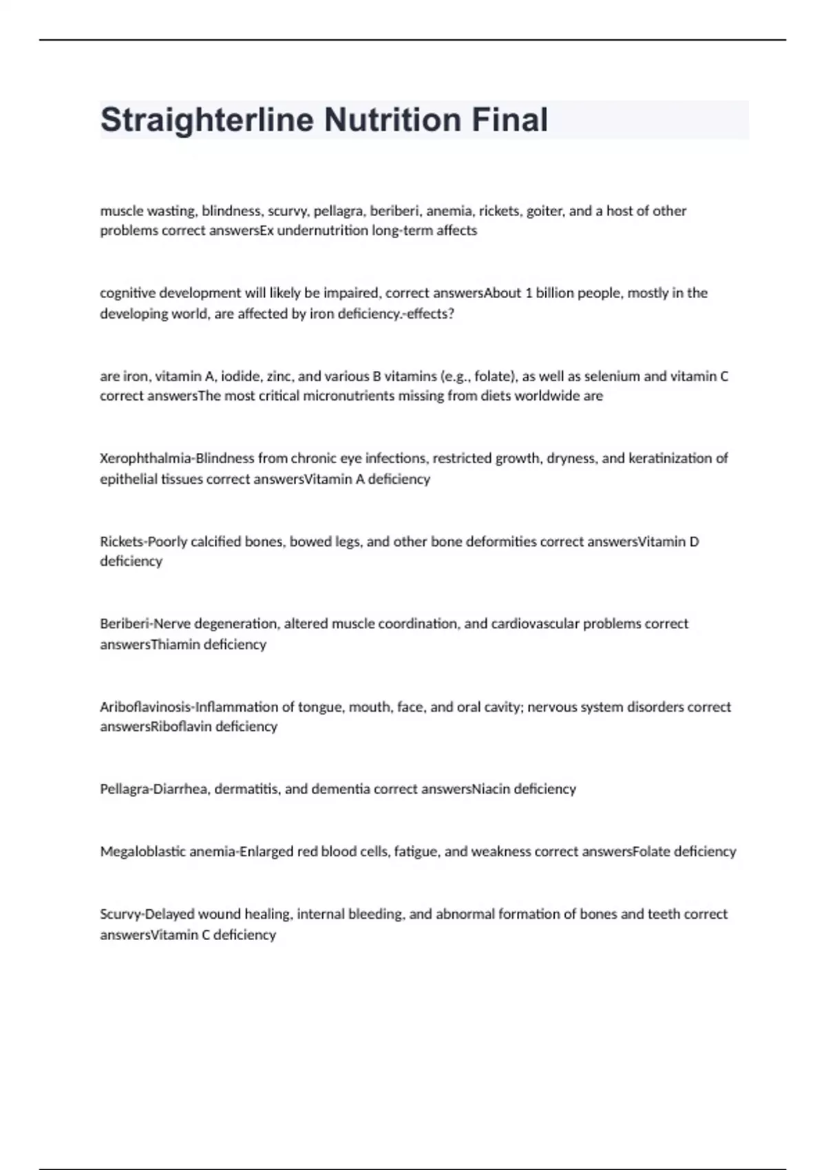 muscle wasting, blindness, scurvy, pellagra, beriberi, anemia, rickets, goiter, and a host of other problems correct answersEx undernutrition long-term affects cognitive development will likely be impaired, correct answersAbout 1 billion people, mostly in the developing world, are affected by iron deficiency.-effects? are iron, vitamin A, iodide, zinc, and various B vitamins (e.g., folate), as well as selenium and vitamin C correct answersThe most critical micronutrients missing from diets worldwide are Xerophthalmia-Blindness from chronic eye infections, restricted growth, dryness, and keratinization of epithelial tissues correct answersVitamin A deficiency Rickets-Poorly calcified bones, bowed legs, and other bone deformities correct answersVitamin D deficiency Beriberi-Nerve degeneration, altered muscle coordination, and cardiovascular problems correct answersThiamin deficiency Ariboflavinosis-Inflammation of tongue, mouth, face, and oral cavity; nervous system disorders correct answersRiboflavin deficiency Pellagra-Diarrhea, dermatitis, and dementia correct answersNiacin deficiency Megaloblastic anemia-Enlarged red blood cells, fatigue, and weakness correct answersFolate deficiency Scurvy-Delayed wound healing, internal bleeding, and abnormal formation of bones and teeth correct answersVitamin C deficiency