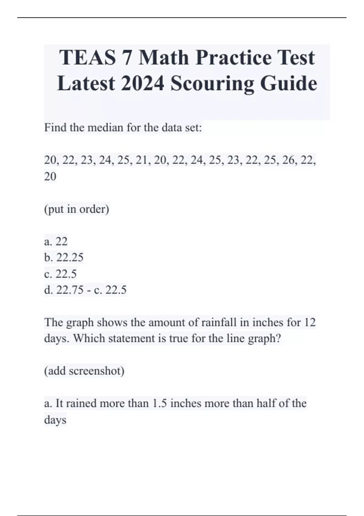 TEAS 7 Math Practice Test Latest 2024 Scouring Guide Find the median for the data set: 20, 22, 23, 24, 25, 21, 20, 22, 24, 25, 23, 22, 25, 26, 22, 20 (put in order) a. 22 b. 22.25 c. 22.5 d. 22.75 - c. 22.5 The graph shows the amount of rainfall in inches for 12 days. Which statement is true for the line graph? (add screenshot) a. It rained more than 1.5 inches more than half of the days b. The average amount of rainfall was 1 inch. c. It rained every day. d. The amount of rainfall steadily increased throughout the days. - c. It rained every day Megan served a dinner party while at work and earned a 22% tip from the customers. If Megan received $16.50 as her tip, what was the customer's bill? Part/ whole = %/100 or Part/% a. $66.75 b. $363 c. $75 d. $82.50 - c. $75 The number 20 is approximately 15% of what value? Part/% a. 133 b. 120 c. 144 d. 127 - a. 133 Convert 2.5 miles to feet. 1 mile = 5,280 ft a. 2,112 feet b. 2,640 feet c. 10,560 feet d. 13,200 feet - d. 13,200 feet A doctor writes a prescription for 0.5 liters of liquid medicine to a patient. How many milliliters (mL) will the medicine bottle be filled with? 1 L = 1,000 mL a. 500 mL b. 5 mL c. 5,000 ml d. 50 mL - a. 500 mL (8x^2 - 6x - 3) - (4x^2 - 5x + 4) a. 4x^2 - 11x - 7 b. 4x^2 - 11x + 1 c. 4x^2 - x - 7 d. 4x^2 - x + 1 - c. 4x^2 - x - 7 Convert 1/8 to a decimal. Round to the nearest hundredth. a. 0.18 b. 0.13 c. 0.018 d. 0.12 - b. 0.13 A patient's fever is 102 degrees F. Convert the temperature to Celsius scale. (32°F − 32) × 5/9 = 0°C a. 39 degrees C b. 25 degrees C c. 24 degrees C d. 18 degrees C - a. 39 degrees C A pizza shop sells individual pizza slices throughout the day in addition to whole pizza orders. The shop sells 3/8 of a cheese pizza, 3/8 of a pepperoni pizza, and 2/5 of a specialty pizza. How many pizzas did they sell in individual slices? a. 1 1/4 b. 1 3/20 c. 8/21 d. 1 1/2 - b. 1 3/20 What is 32 out 160 as a percent? a. 12% b. 20% c. 50% d. 22% - b. 20% Two friends got the same percentage of math questions right on their tests. One friend got 96 questions correct out of 120 questions. If the second friend took an exam with only 75 questions, how many did she answer correctly? a. 56 b. 63 c. 60 d. 58 - c. 60 Solve the equation for the unknown. 4x + 3 = 8 a. - 2 b. - 5/4 c. 5/4 d. 2 - c. 5/4 Multiply. 4/5 x 1/5 a. 4/25 b. 2/5 c. 3/5 d. 16/25 - a. 4/25 The following circle graph shows what a family spends their income on each month. If the family earns $6,500 a month, how much money are they spending on their bills? a. 975 b. 1950 c. 1300 d. 1625 - d. 1625 A homeowner is renovating their kitchen and needs 75 square feet of tile for the backsplash. The tile contractor requires a 15% overage of tiles to complete the job. How many square feet of tile does the homeowner need to purchase? (Fill in the blank. Round the answer to the nearest tenth. Use a leading zero if it applies. Do not use a trailing zero.) - 86.3 A yield sign in the shape of a triangle has a base length of 90 centimeters and a height of 80 centimeters.