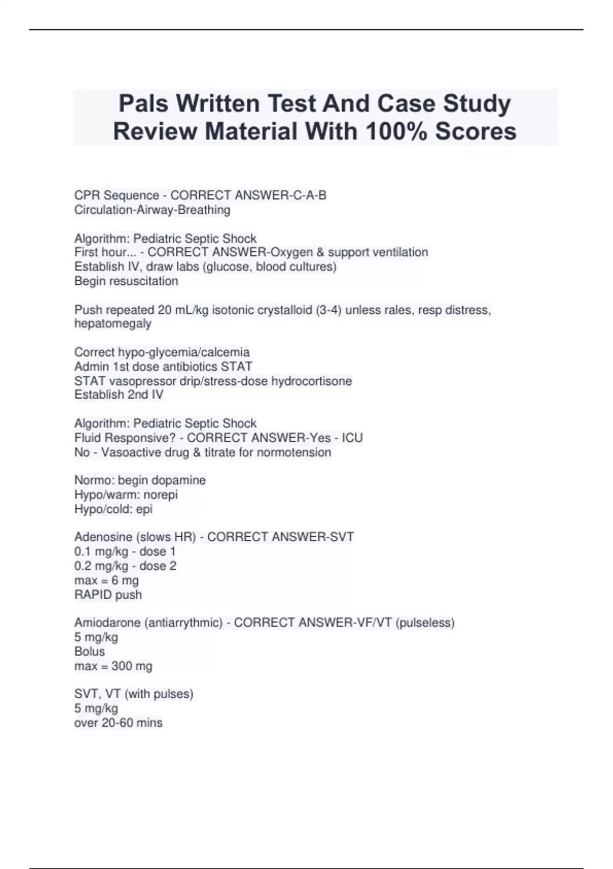 Pals Written Test And Case Study Review Material With 100% Scores CPR Sequence - CORRECT ANSWER-C-A-B Circulation-Airway-Breathing Algorithm: Pediatric Septic Shock First hour... - CORRECT ANSWER-Oxygen & support ventilation Establish IV, draw labs (glucose, blood cultures) Begin resuscitation Push repeated 20 mL/kg isotonic crystalloid (3-4) unless rales, resp distress, hepatomegaly Correct hypo-glycemia/calcemia Admin 1st dose antibiotics STAT STAT vasopressor drip/stress-dose hydrocortisone Establish 2nd IV Algorithm: Pediatric Septic Shock Fluid Responsive? - CORRECT ANSWER-Yes - ICU No - Vasoactive drug & titrate for normotension Normo: begin dopamine Hypo/warm: norepi Hypo/cold: epi Adenosine (slows HR) - CORRECT ANSWER-SVT 0.1 mg/kg - dose 1 0.2 mg/kg - dose 2 max = 6 mg RAPID push Amiodarone (antiarrythmic) - CORRECT ANSWER-VF/VT (pulseless) 5 mg/kg Bolus max = 300 mg SVT, VT (with pulses) 5 mg/kg over 20-60 mins max = 300 mg Atropine (increases HR) - CORRECT ANSWER-Bradycardia 0.02 mg/kg may repeat once Epinepherine (increases HR) - CORRECT ANSWER-Bradycardia/Pulseless Arrest 0.01 mg/kg (1:10,000) every 3-5 min Hypotensive Shock 0.1-1 mcg/kg per min Anaphylaxis 0.01 mg/kg every 3-5 min Algorithm: Pediatric Cardiac Arrest - CORRECT ANSWER-Shout for help CPR Oxygen, AED If no shock - CPR for 2 min, IV, Epi q 3-5 min, reassess If shock - after...CPR for 2 min, IV, reassess If 2nd shock - CPR for 2 min, Epi q 3-5 min, reassess If 3rd shock - CPR for 2 min, Amiodarone, treat cause, reassess... Post Resuscitation Care Shock Doses - CORRECT ANSWER-1st shock - 2 j/kg 2nd shock - 4 j/kg Max 10 j/kg Reversible Causes of Pediatric Cardiac Arrest (H&T's) 6 H's (G,K,T,V,X,DRO) - CORRECT ANSWER-1. Hypo-Glycemia 2. Hypo/hyper-Kalemia 3. Hypo-Thermia 4. Hypo-Volemia 5. Hypo-Xia 6. HyDROgen ion (acidosis) Reversible Causes of Pediatric Cardiac Arrest (H&T's) 5 T's (A,E,HC,HP,O) - CORRECT ANSWER-1. Tamponade, cardiac 2. Tension pneumothorax 3. Thrombosis, coronary 4. Thrombosis, pulmonary 5. Toxins Rescue Breaths - CORRECT ANSWER-1 every 6-8 secs
