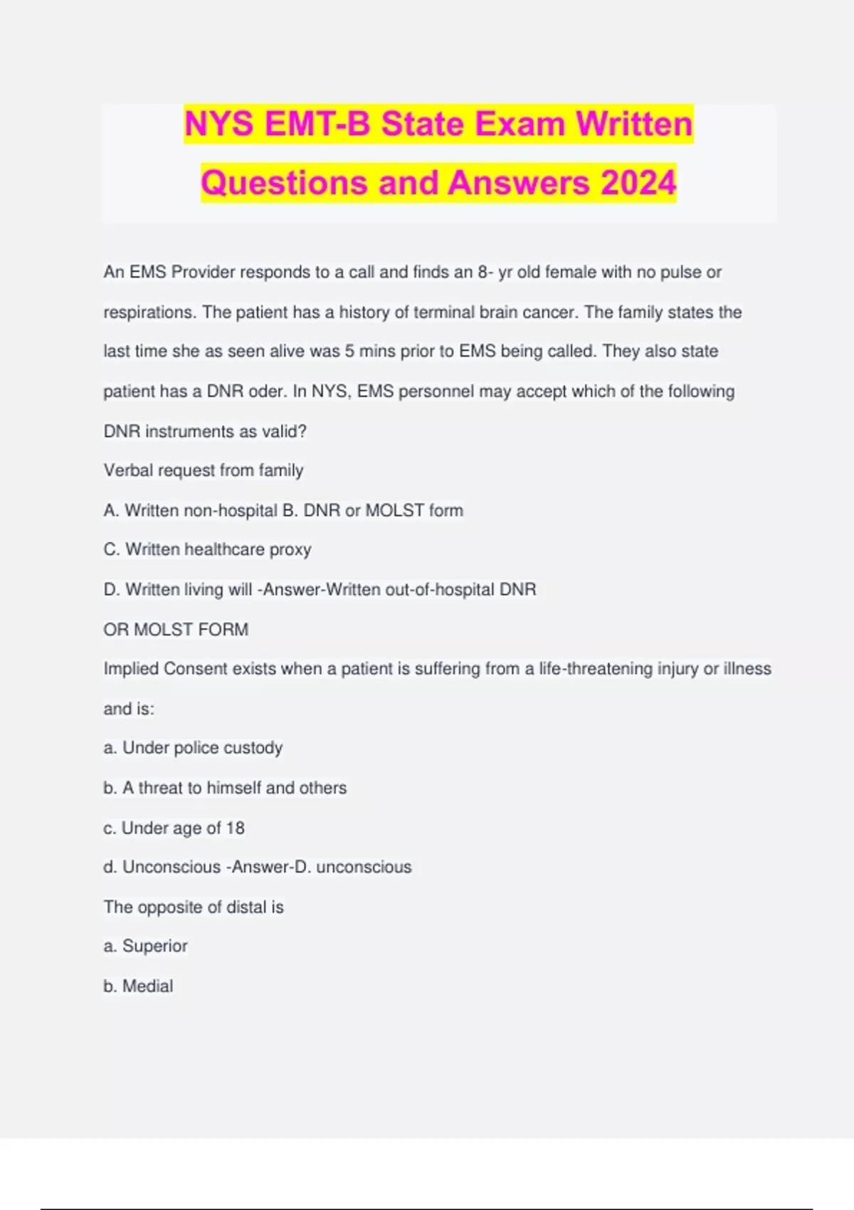 NYS EMT-B State Exam Written Questions and Answers 2024 An EMS Provider responds to a call and finds an 8- yr old female with no pulse or respirations. The patient has a history of terminal brain cancer. The family states the last time she as seen alive was 5 mins prior to EMS being called. They also state patient has a DNR oder. In NYS, EMS personnel may accept which of the following DNR instruments as valid? Verbal request from family A. Written non-hospital B. DNR or MOLST form C. Written healthcare proxy D. Written living will -Answer-Written out-of-hospital DNR OR MOLST FORM Implied Consent exists when a patient is suffering from a life-threatening injury or illness and is: a. Under police custody b. A threat to himself and others c. Under age of 18 d. Unconscious -Answer-D. unconscious The opposite of distal is a. Superior b. Medial c. Lateral d. Proximal -Answer-D. Proximal The chamber of the heart that is most muscular and that pumps the most blood into the aorta is the a. Right atrium b. Left ventricle c. Right ventricle d. Left atrium -Answer-B. LEFT VENTRICLE In correct sequence (VERTEBRAE SECTIONS) and number in each section -Answer-cervical (7), thoracic (5), lumbar (12), sacral (5), and coccygeal (4) The purpose of the first set of vital signs is to: -Answer-A. establish a baseline for additional evaluations PCR has how many spots for writing vital signs? -Answer-3 spots When you take the pulse of a patient, you are really a. Counting pressure waves of blood that the heart sends through an artery b. Feeling the swelling of the vein as each wave of blood passes back to the heart c. Noting the heartbeats in the column of blood in a large vein d. Feeling the vibrations of the heart muscles as they push the blood through -Answer- A. counting the pressure waves of blood that the heart sends through an artery In people whose skin is darkly pigmented, cyanosis is BEST seen by observing a. Mucosal membrane