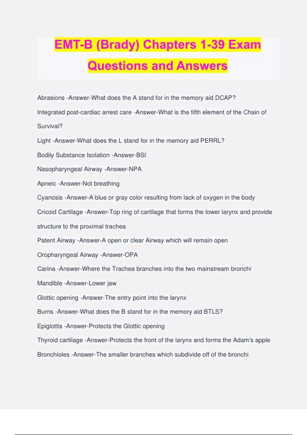 EMT-B (Brady) Chapters 1-39 Exam Questions and Answers Abrasions -Answer-What does the A stand for in the memory aid DCAP? Integrated post-cardiac arrest care -Answer-What is the fifth element of the Chain of Survival? Light -Answer-What does the L stand for in the memory aid PERRL? Bodily Substance Isolation -Answer-BSI Nasopharyngeal Airway -Answer-NPA Apneic -Answer-Not breathing Cyanosis -Answer-A blue or gray color resulting from lack of oxygen in the body Cricoid Cartilage -Answer-Top ring of cartilage that forms the lower larynx and provide structure to the proximal trachea Patent Airway -Answer-A open or clear Airway which will remain open Oropharyngeal Airway -Answer-OPA Carina -Answer-Where the Trachea branches into the two mainstream bronchi Mandible -Answer-Lower jaw Glottic opening -Answer-The entry point into the larynx Burns -Answer-What does the B stand for in the memory aid BTLS? Epiglottis -Answer-Protects the Glottic opening Thyroid cartilage -Answer-Protects the front of the larynx and forms the Adam's apple Bronchioles -Answer-The smaller branches which subdivide off of the bronchi Lower Airway -Answer-Trachea, Carina, Bronchi, Bronchioles, Alveoli, Pulmonary capillaries Upper Airway -Answer-Mouth and Nose, Pharynx, and hypopharynx (laryngoparynx) Pharynx -Answer-The throat Mouth -Answer-Primarily designed to be the entrance of the digestive system Laryngopharnx -Answer-Hypopharynx is also known as the... Alveoli -Answer-Tiny sacs that occur in grape-like bunches are called? Pulmonary Capillaries -Answer-Capillaries that surround the Alveoli are called? Pharynx -Answer-Oropharynx, Nasopharynx, and the Laryngopharynx (Hypopharynx) make up what? Bronchoconstriction -Answer-The contraction of the smooth muscle that lines the bronchial passages that result in a decreased internal diameter of the airway and increased resistance Constriction -Answer-Decreased internal diameter Dilate -Answer-Increased internal diameter Stridor -Answer-A high pitched sound generated from a partially obstructed air flow in the upper airway Edema -Answer-Swelling Pain -Answer-What does the P stand for in the memory aid AVPU? Immediate recognition and activiation -Answer-What is the first element of the Chain of Survival? Lacerations -Answer-What does the L stand for in the memory aid BTLS? Sniffing -Answer-A bolt upright position with the head pitched forward is known as the _______ position. Intact Muscle Tone -Answer-Having control of the muscles that form the airway is known as? Alert -Answer-What does the A stand for in the memory aid AVPU? Acute -Answer-Sudden, immediately following an incident Chronic -Answer-Occurring over a period of time Acute Stress -Answer-Stress reaction immediately following an incident or shortly after Chronic Stress -Answer-Stress reaction which occurs days, weeks, months, or even years after an incident Inadequate Breathing -Answer--No breathing or air movement -Evidence of foreign bodies in the airway -Air exchange rate is subnormal -Unable or having difficulty speaking -Wheezing, stridor, gasping, gurgling, etc. -In children, retraction and nasal flaring These are signs of what? Hoarseness -Answer-Voice changes, raspy voice, like stridor Snoring -Answer-The sound of the soft tissue of the upper airway creating a partial obstruction of air flow Gurgling -Answer-The sound of fluid obstructing the airway Head Tilt, Chin Lift Maneuver -Answer-Tilting the head back and lifting the chin in order to attempt to open the airway when NO trauma us suspe