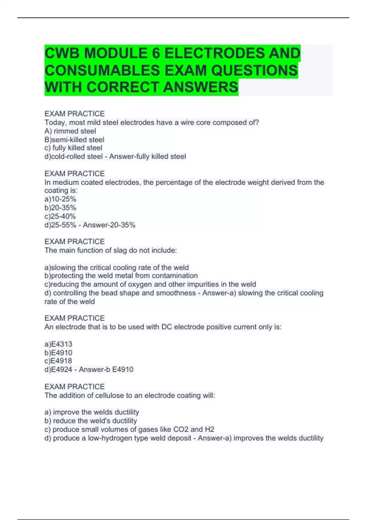 CWB MODULE 6 ELECTRODES AND CONSUMABLES EXAM QUESTIONS WITH CORRECT ANSWERS