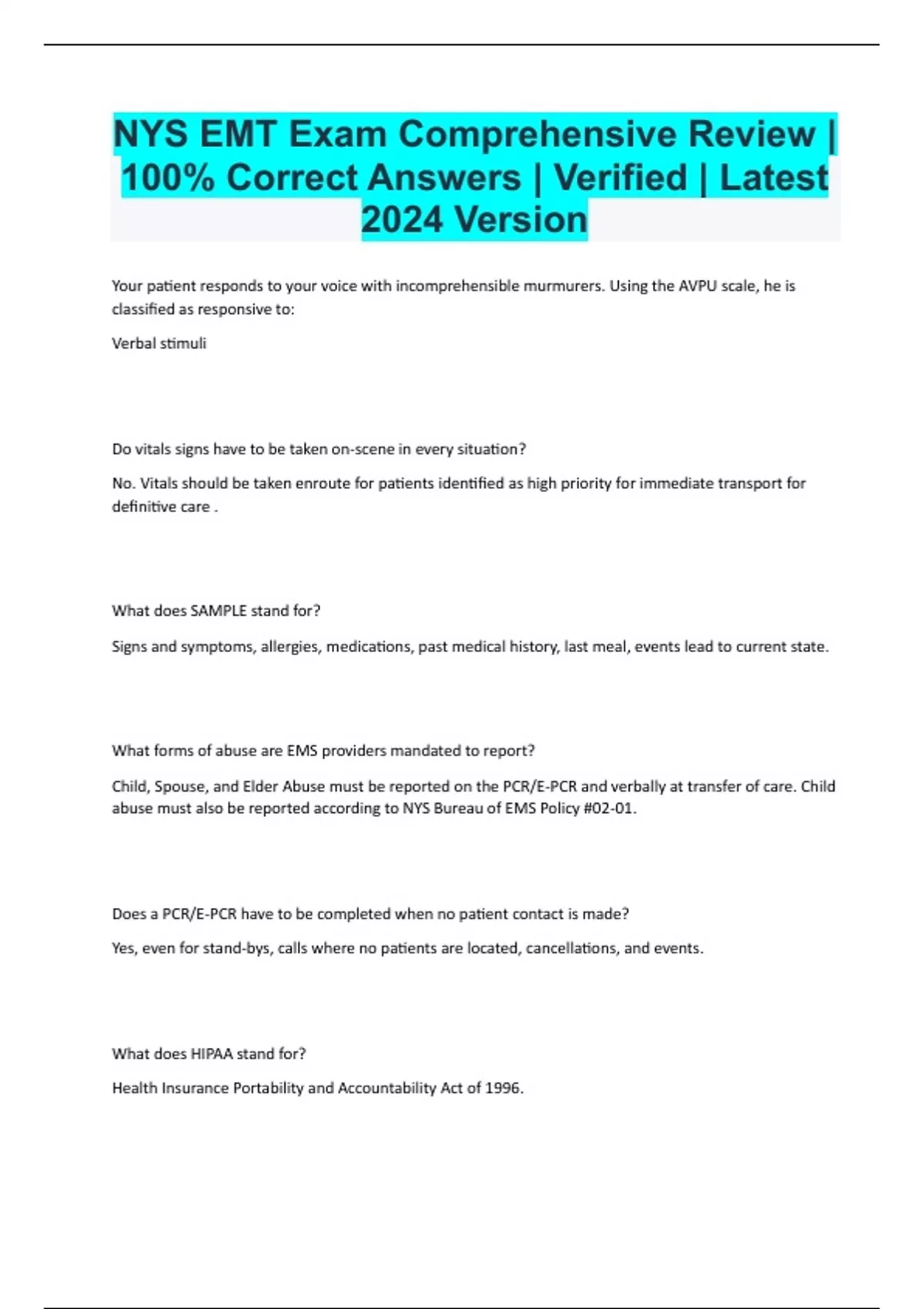 Your patient responds to your voice with incomprehensible murmurers. Using the AVPU scale, he is classified as responsive to: Verbal stimuli Do vitals signs have to be taken on-scene in every situation? No. Vitals should be taken enroute for patients identified as high priority for immediate transport for definitive care . What does SAMPLE stand for? Signs and symptoms, allergies, medications, past medical history, last meal, events lead to current state. What forms of abuse are EMS providers mandated to report? Child, Spouse, and Elder Abuse must be reported on the PCR/E-PCR and verbally at transfer of care. Child abuse must also be reported according to NYS Bureau of EMS Policy #02-01. Does a PCR/E-PCR have to be completed when no patient contact is made? Yes, even for stand-bys, calls where no patients are located, cancellations, and events