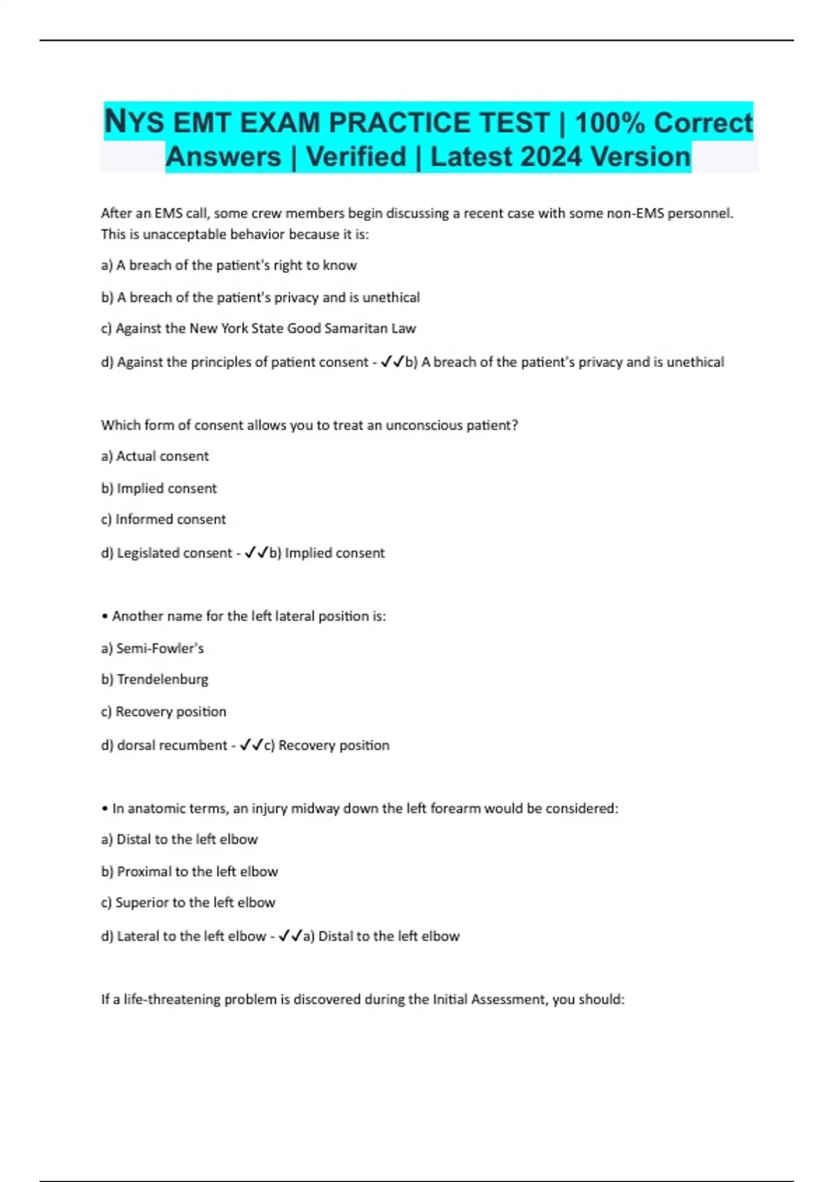After an EMS call, some crew members begin discussing a recent case with some non-EMS personnel. This is unacceptable behavior because it is: a) A breach of the patient's right to know b) A breach of the patient's privacy and is unethical c) Against the New York State Good Samaritan Law d) Against the principles of patient consent - b) A breach of the patient's privacy and is unethical Which form of consent allows you to treat an unconscious patient? a) Actual consent b) Implied consent c) Informed consent d) Legislated consent - b) Implied consent • Another name for the left lateral position is: a) Semi-Fowler's b) Trendelenburg c) Recovery position d) dorsal recumbent - c) Recovery position • In anatomic terms, an injury midway down the left forearm would be considered: a) Distal to the left elbow b) Proximal to the left elbow c) Superior to the left elbow d) Lateral to the left elbow - a) Distal to the left elbow
